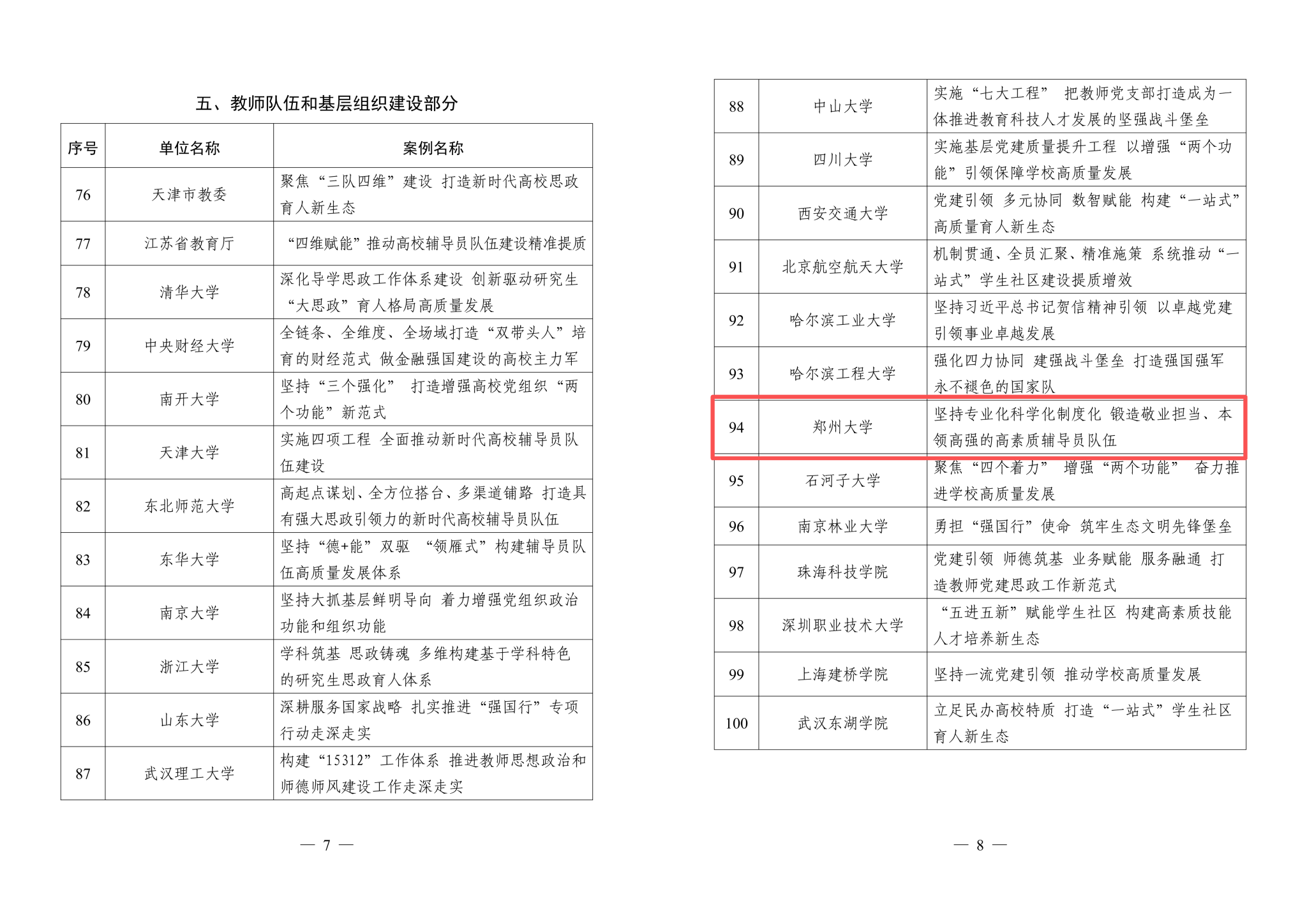 3月25日,教育部发布首批新时代学校思想政治教育典型案例,郑州大学申报的《坚持专业化科学化制度化 锻造敬业担当、本领高强的高素质辅导员队伍》成功入选,成为河南省唯一入选该批次案例的高校。