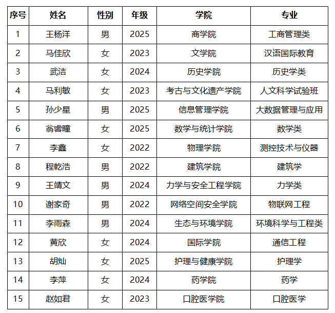 根据中国宋庆龄基金会工作安排,郑州大学2025—2026学年中国宋庆龄基金会“中国海油大学生助学基金”的评审工作于9月17日正式启动,经过学院推荐,学生处评审两个阶段,确定商学院王杨洋等15名同学为拟受助学生。现对该名单进行公示,公示期为3天(9月26日-9月29日),若无异议,该评审结果将于公示期结束后自动生效。