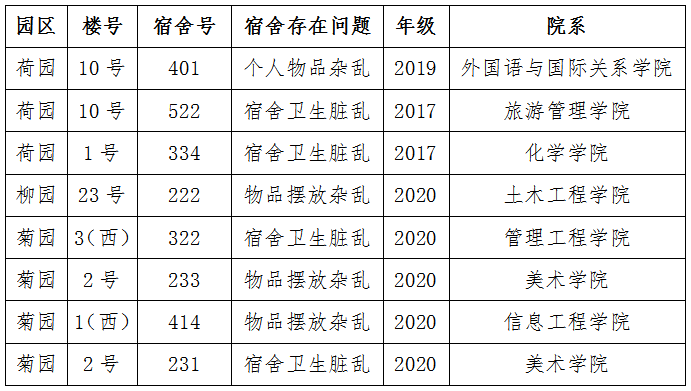 本周学生自律委员会对全体本科新生以及部分高年级学生宿舍进行了巡查,巡查中发现学生宿舍安全情况良好,未发现存放违章电器等问题,但部分宿舍仍存在个人物品摆放杂乱、宿舍卫生脏乱差、异味严重等卫生问题。结合本周巡查实际情况,现将存在卫生问题较为突出的宿舍通报如下: