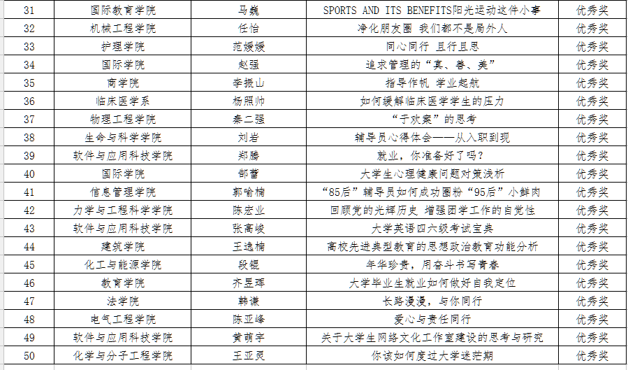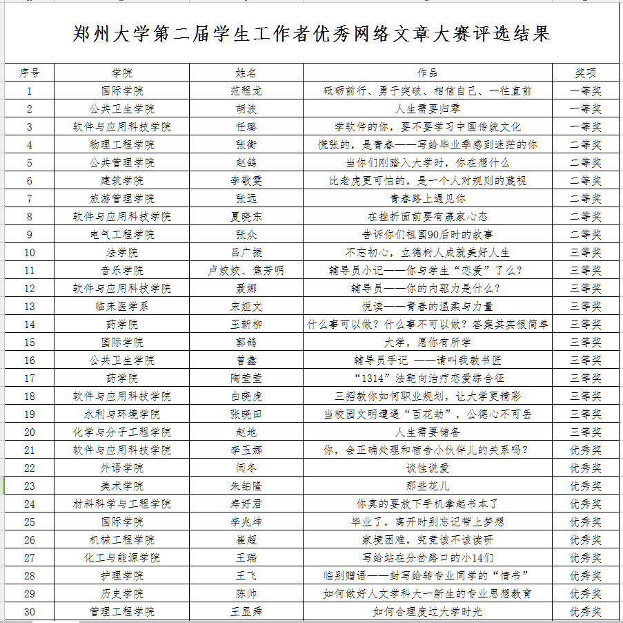 为进一步贯彻落实全国和全省高校思想政治工作会议精神,加强学校网络思想政治教育工作,推进学校网络文化建设,供给优秀的网络文化作品,服务学生成长成才和学校“双一流”建设,党委学生工作部于近日举办了第二届学生工作者网络文章大赛。根据公平、公正以及注重质量和工作实效的评审原则,结合文章的思想性、实效性、创新性、互动性等,党委学生工作部邀请专家对参赛作品进行综合打分和评议。最终,评选出一等奖3篇,二等奖6篇,三等奖11篇,优秀奖30篇。现将结果予以公布: