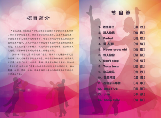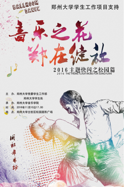 2016年“音乐之花 郑在绽放”学生工作项目将以系列主题快闪的形式,融合荷园、松园眉湖、松林、钟楼等郑州大学标志性地理和文化地标进行实施和开展。本次项目演出将在主校区松园的圆形广场进行一场国标舞的专场演出。