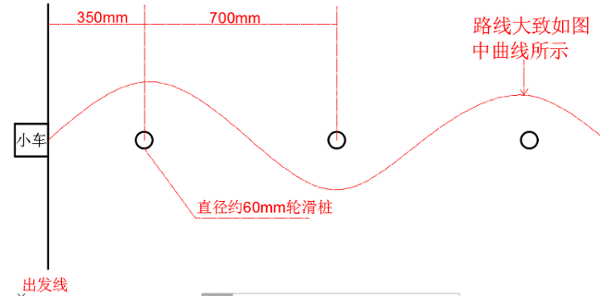 1.曲线组:本组以重锤落下一次小车绕过桩的数量多少为评判标准。桩的数量为10个,桩与桩之间的距离为70cm,起点到第一个桩的距离为35cm,重锤下落的距离为70cm(不得大于此值),重锤的质量为 1 kg。除重锤落下时所提供的重力势能外不能有其他的能量来源。转向机构使用同一套能量来源。