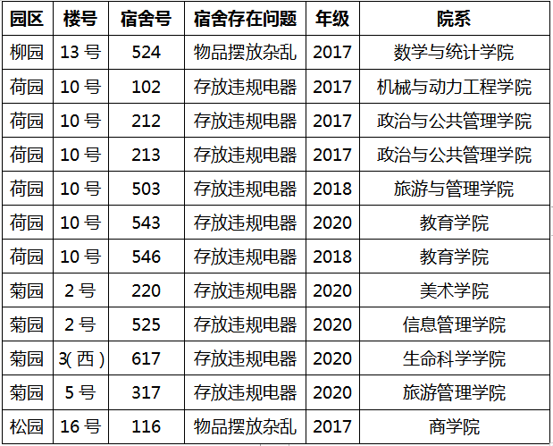 本周学生自律委员会巡查了本科生宿舍,巡查中发现部分宿舍存在存放违规电器、个人物品摆放杂乱等问题。结合本周巡查实际情况,现将存在安全问题较为突出的宿舍通报如下: