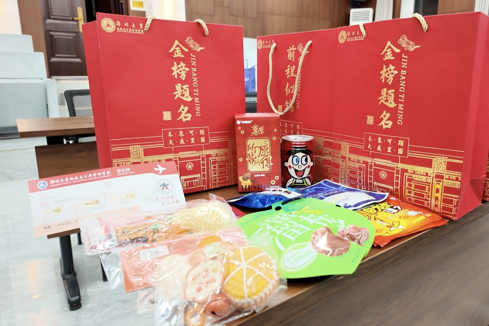 与会领导老师们为同学们逐一发放“暖心大礼包”并合影留念。这份精心筹备的礼包包含十件寓意美好的物品:实用的文具套装寓意一笔定乾坤的诚挚祝愿,“愿皆成真”薯愿薯片寄托笔下生花的期许,“巧克难关”巧克力寓意破解难题、顺利通关,“好柿发生”捏捏乐祝愿备考顺心无忧,“一举夺魁”向日葵钥匙扣象征金榜题名,“养‘睛’蓄锐”蒸汽眼罩守护用眼健康,“烦恼‘梅梅’”溜溜梅期许轻装上阵,“运气‘旺旺’”旺仔牛奶祝福考途畅达,“暖意相伴”暖宝宝传递持续关怀,“奔赴成功”登机牌卡片则勉励学子以“天下为公”的初心奔赴理想彼岸。十件礼物寓意“十全十美”,每一份都承载着学院对学子的深切期盼。