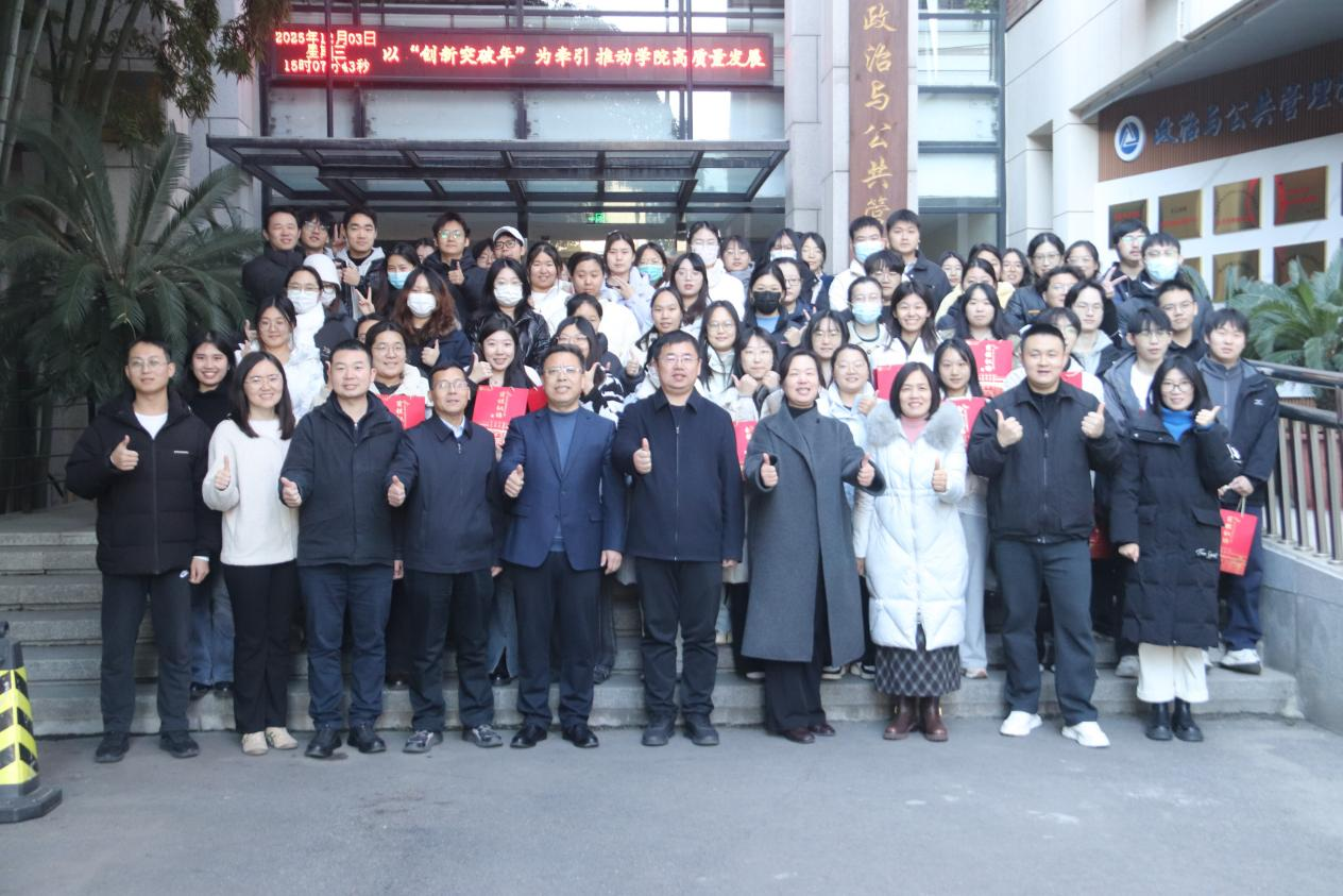 12月3日下午,政治与公共管理学院举办了“2026届本科生考研考公送温暖”活动。政治与公共管理学院党委书记于建军,院长、党委副书记孙远太,党委副书记、纪委书记陈文新,副院长马润凡,党委副处级组织员王高阳,团委书记赵鸽,学工办主任刘烨,团委副书记徐轶轶、2022级辅导员张坤、2022级兼职辅导员田珂萌等老师共同出席,为紧张备考的学子送上暖心物资与真诚祝福。活动由政治与公共管理学院党委副书记李润玮主持。