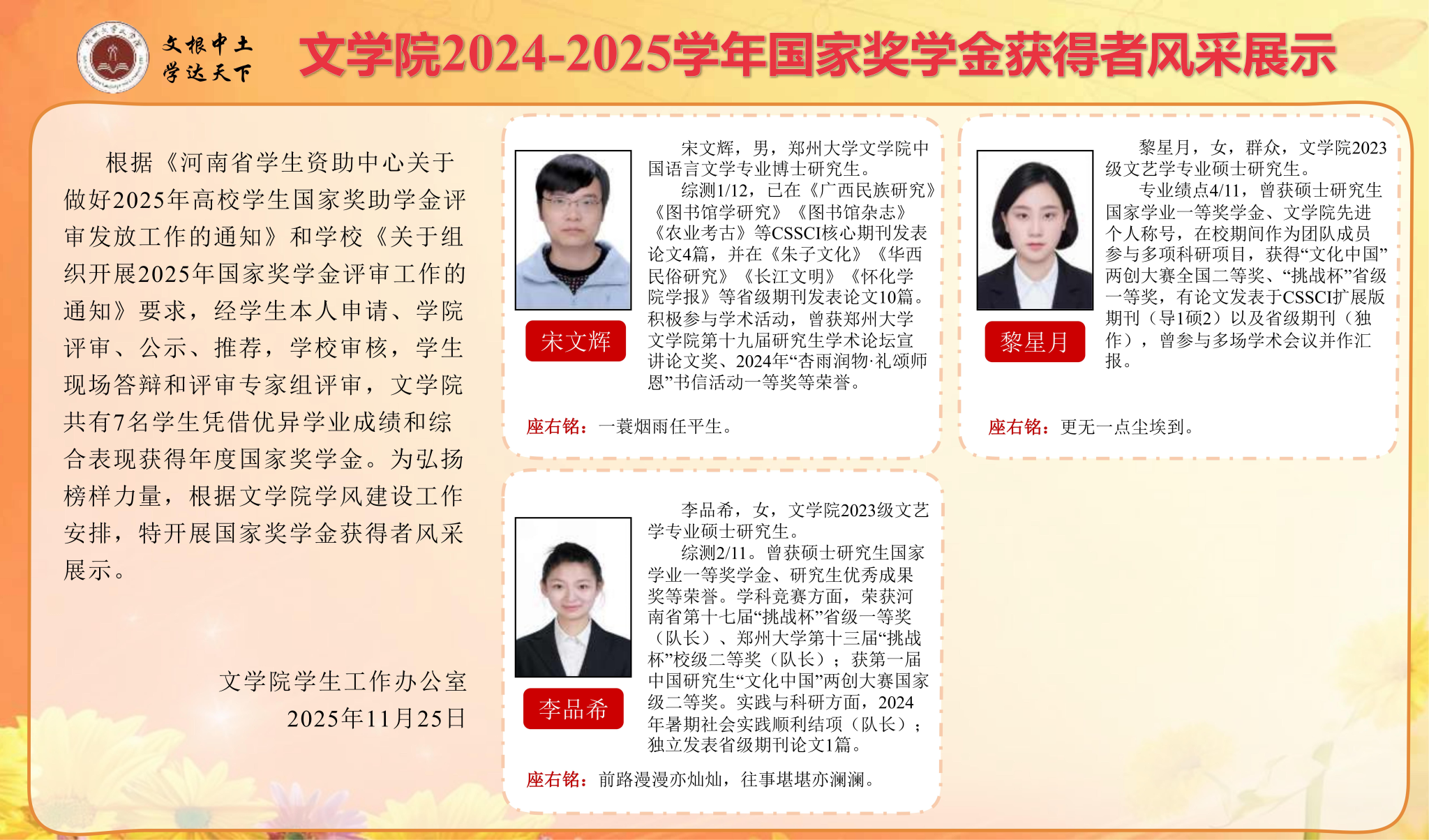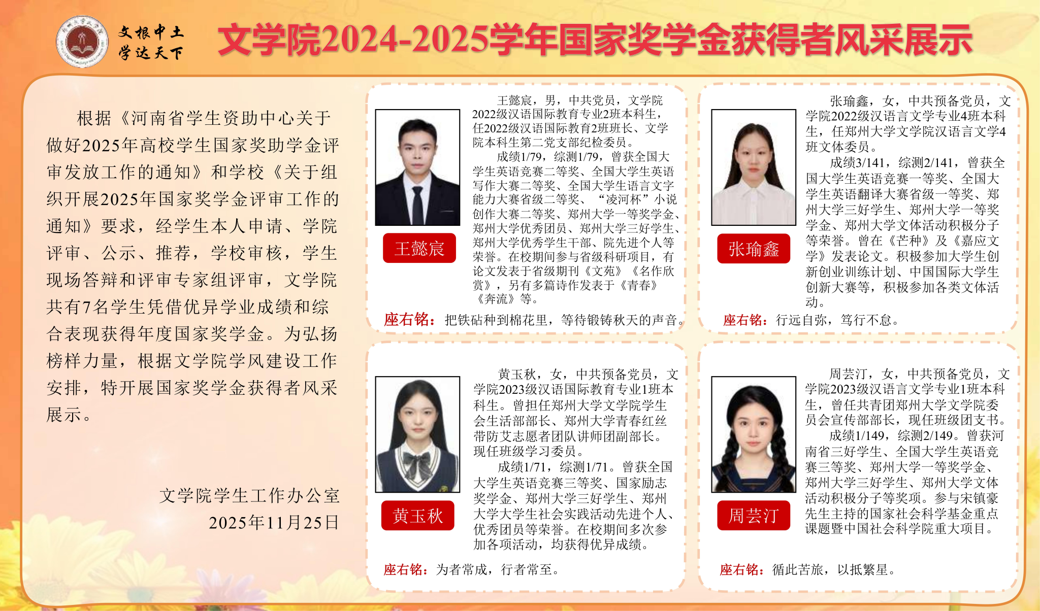 为彰显榜样力量,激励学生勤奋学习、追求卓越,学院在楼内电子屏集中展示文学院2024-2025学年国家奖学金获得者风采,获奖学生包括本科生王懿宸、张瑜鑫、黄玉秋、周芸汀,硕士研究生黎星月、李品希,博士研究生宋文辉,他们勤学笃行,全面发展,学业与综合表现优异,激励广大同学见贤思齐、追求卓越。