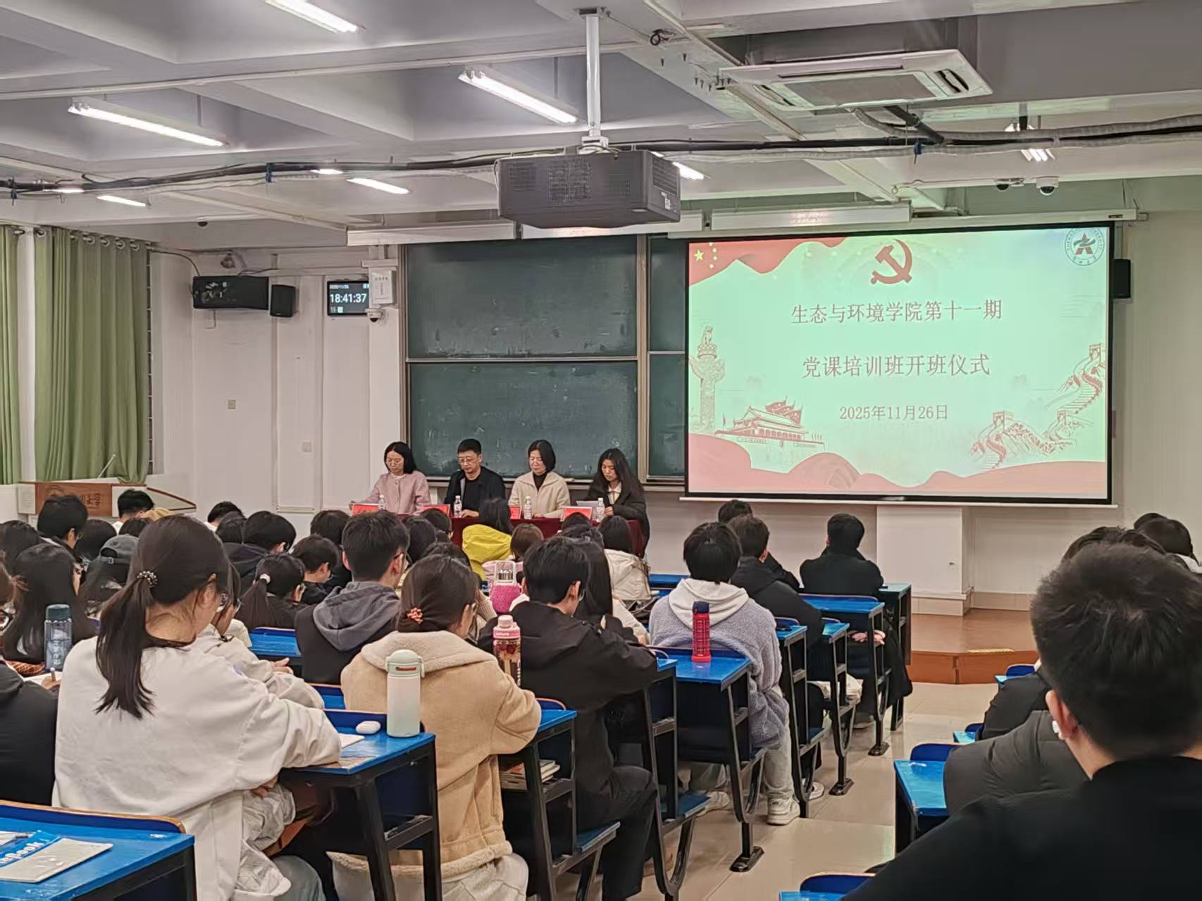 11月26日晚,生态与环境学院举办的党课培训班开班仪式在环保馆101教室举行。生态与环境学院党委书记张彤军,党委副书记、纪委书记冯瑞晓,研究生工作高级主管侯姣老师,本科生辅导员魏琳奕老师以及来自生态与环境学院的入党积极分子和发展对象参加开班仪式。开班仪式由冯瑞晓主持。