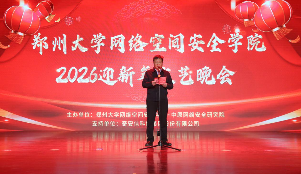 金马踏歌辞旧岁,欢歌载舞迎新年。2025年12月26日晚,郑州大学网络空间安全学院2026迎新年文艺晚会在郑州大学北校园科技报告厅举行。奇安信集团河南分区总经理熊国强,奇安信集团河南分区副总经理齐壮,第五附属医院纪委书记王爱华,郑州大学北校区综合管理中心副主任曹矿林,后勤保障部副部长黄晓峰,保卫处副处长滕海昕,网络空间安全学院全体领导班子成员及师生代表800余人齐聚一堂,在歌舞欢腾中告别过往,在青春激昂中奔赴新程。