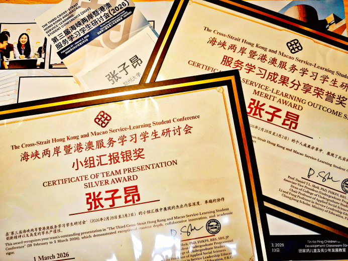 2 月 27 日至 3 月 3 日,第三届海峡两岸暨港澳服务学习学生研讨会在香港理工大学举办。我校政治与公共管理学院 2023 级行政管理专业本科生张子昂在会议中获得服务学习成果荣誉奖与小组汇报银奖两项荣誉。学院行政管理专业丁辉侠教授担任本次参会学生的专业指导教师。