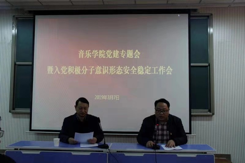 为贯彻落实党中央关于加强党的政治建设的意见精神,提升学院意识形态工作,音乐学院党建专题会暨入党积极分子意识形态安全稳定工作会议于3月7日召开。学院党总支书记高可、学工办副主任焦芳明出席本次会议,教工党支部、研究生党支部和本科生党支部的130余名党员和入党积极分子参加会议。会议由焦芳明主持。