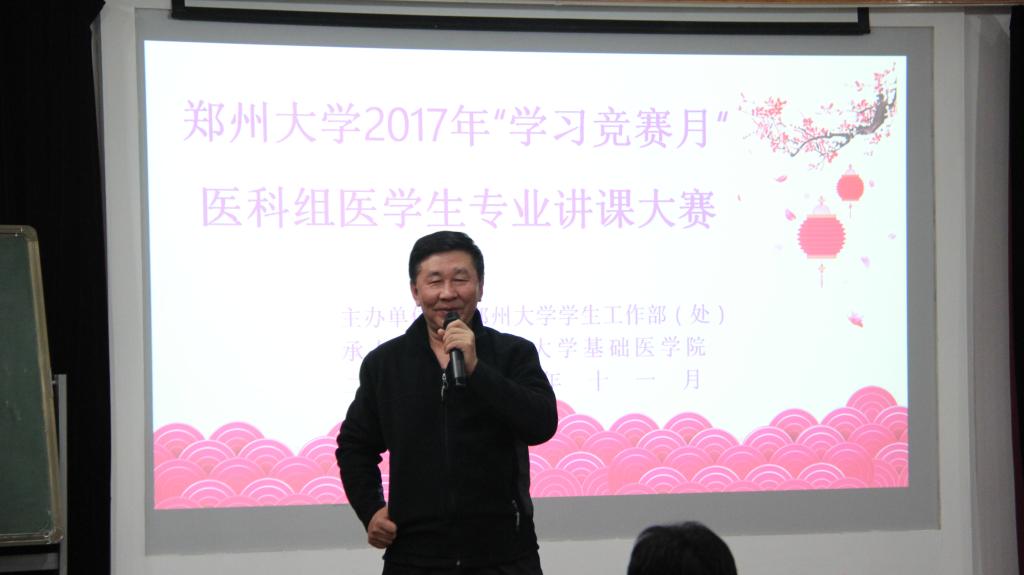为贯彻落实学校开展“学习竞赛月”活动的要求,进一步强化学风建设,营造良好的学习氛围,根据主办方郑州大学学生处《关于组织开展2017年“学习竞赛月”通知》的精神,郑州大学基础医学院作为医科组的组长于11月28号晚在基础医学院学术报告厅承办了郑州大学基础医学院医科组医学生专业讲课大赛。其中医学检验系党委书记张洁老师,基础医学院薛长贵教授,临床医学系党委副书记雷芸芸老师,护理学院党委副书记樊卫华老师,口腔医学院副院长朱保玉老师,基础医学院党委副书记陈颖老师,药学院办公室主任邵彦江老师莅临本次活动,并作为评委对参赛选手们的表现进行了评判。