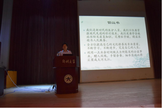 同时,赵教授对同学们强调,毕业后大多数同学都会成为一名医生,我们正处于崭新的历史时代,科学社会主义在中国正显示蓬勃的生机活力,我们要把我们的国家建成富强民主文明和谐美丽的社会主义现代化强国。我们任重而道远,我们在漫漫人生路上,必将要求索、要实现。他根据自己在临床工作的几十年经验及工作实际就“如何做一个新时代的好医生”进行了深刻阐述,他指出:第一,我们一定要有宗旨意识要有全心全意为人民服务的思想,时刻想着人民,始终把人民的利益放在至高无上的位置。第二,我们一定要持之以恒地学习养成终生学习的习惯,更要向实践学,并且要学会独立思考,学会主动发现问题、解决问题。第三,用哲学观点指导我们临床实践。在处理疾病时要学会抓住主要矛盾,学会用动态观点看问题。要有全局观念,要有整体意识,绝不能教条主义,要学习掌握全方位的诊疗技术,也要会预防、学会康复。第四,要理论联系实际,要温故而知新。要认识到我们所学知识局限性,在知识大爆炸的时代,新知识、新理论、新技术层出不穷,我们要不断新陈代谢,要推陈出新不断进步。第五,要自由而全面发展。要提升自己的综合素质,学习哲学、历史、地理、文学、美学、传统文化,这些人文学知识是一个人综合素质提升的基础,它会影响你的综合实力。第六,要用习近平新时代中国特色社会主义思想指导我们全部工作。习近平新时代中国特色社会主义思想具有鲜明的人民立场,具有鲜明的时代特点,具有很强的实践性,它让我们明确我们祖国未来的发展方向。要始终坚信中国特色社会主义制度最大优越性就是中国共产党领导。没有中国共产党,我们的梦想不会实现,我们的目标不会达到。
