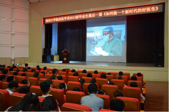 为深入学习贯彻党的十九大精神和习近平新时代中国特色社会主义思想,贯彻落实全国、全省高校思想政治工作会议精神,响应学生工作部关于毕业生“三个一”活动部署,同时向社会展现毕业生的良好形象,临床医学系于2018年5月14日晚7:00在医学院图书馆报告厅邀请郑州大学第二附属医院外科党总支书记赵根尚做了题为“如何做一个新时代的好医生”廉洁教育报告,系常务副主任俞海洋与2018届全体毕业生一起聆听了报告会。