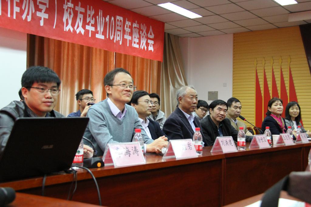 上午10:00,座谈会正式开始,与会人员一同观看了学院发展视频,看到学院在十年间发生的变化和取得的成绩,校友们不禁鼓掌称赞。观看完毕后,首先,齐林致辞,他代表学院向重返母校的校友表示热烈的欢迎,对校友们长期以来支持学校建设与学院发展表示感谢,希望校友们继续关心支持母校,为建设一流大学助力。随后徐世温讲话,对校友的归来表示欢迎,并感谢校友们在无形中为学校作出的巨大贡献。接着,在2004级闫明豪同学的主持下,同学们做了简单介绍,发言中充满着对大学生活的怀念和对母校蓬勃发展的祝愿。之后王忠勇讲话,他寄语校友们珍惜母校情意,努力工作,多回母校看看,并祝愿校友们在各自事业中取得更大的成就。庞军发言中勉励同学们以饱满的热情对待工作、对待生活。侯维岩表示2004年是中澳合作办学的开端,作为首届中澳合作办学学生,同学们都非常优秀,同时也为学院的国际交流合作办学项目提供了宝贵经验,希望大家能继续关心和支持学院建设。