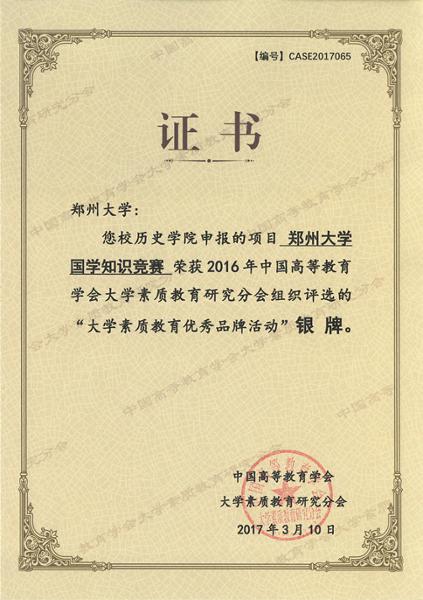 3月10日上午,中国高等教育学会大学素质教育研究分会2017年年会暨第六届大学素质教育高层论坛在南京农业大学召开,由我校嵩阳书院、历史学院和学生处“中原历史文化视域下的校园文化建设”项目组共同举办的“郑州大学国学知识竞赛”活动荣获2016年“大学素质教育优秀品牌活动”的银牌表彰。项目组成员、历史学院国学系副主任侯磊博士受项目组委托前往参会领奖。