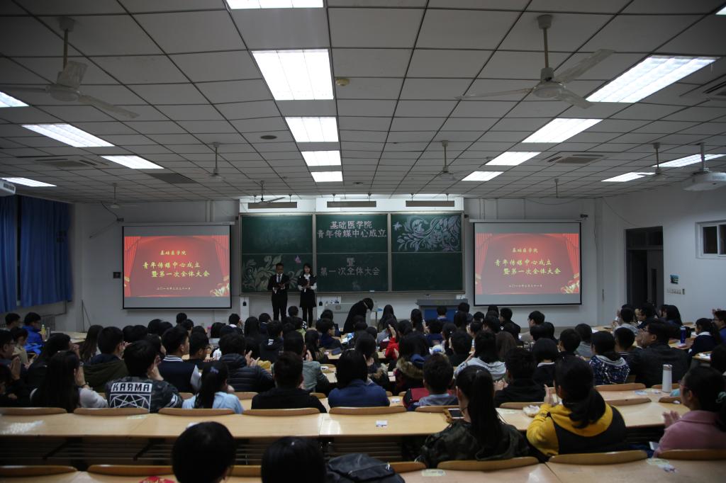 清风送晚霞光飞,海棠飘香迟鹭归。为了进一步适应时代的发展,更加全面地加大团学工作的影响力,郑州大学基础医学院在校团委和院团委的大力支持下,成立了基础医学院青年传媒中心,并于三月三十一日晚七时三十分在北核心教学区1109教室成功举办了青年传媒中心成立暨第一次全体会议。莅临此次会议的嘉宾有基础医学院团委书记仝宏伟老师、基础医学院学生会主席张宇、基础医学院青年传媒中心主任郭禹含、基础医学院团委副书记祝曼曼等。