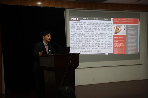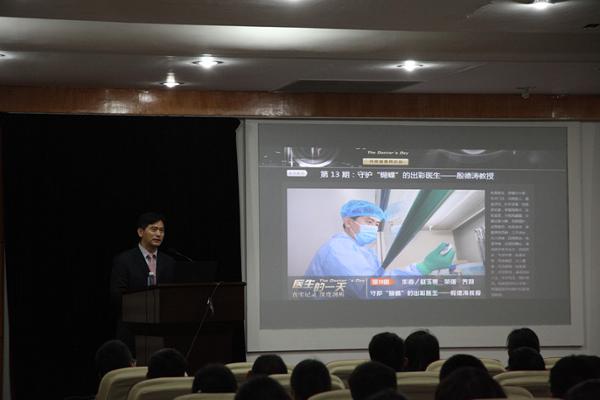 首先,殷教授介绍了从原始医学,古代东西方医学到以模式化、体系化、正规化为特点的近现代医学的发展过程,指出了“救死扶伤、解除病痛、延长生命”这一对于医学自身独特的认知与观点。紧接着,殷教授不仅从讲述一系列事实、介绍医学生的培养周期、引用孟子“天将降大任于斯人也”的论述说明医学专业的艰苦与漫长,强调学医需要终身的学习,如逆水行舟、不进则退;也借用网络上所谓“系解局解,不求甚解”的段子以及临床的部分案例说明了医学基础学科的重要性;同时还提出了包括努力学习英语、多参加课外活动、仰望星空脚踏实地等建议和要求;并在此基础上向参加报告会的同学们推荐了一系列优秀的、有利于本专业学习的影视作品与书籍资料。然后,殷教授话锋一转,开始讲述起自己的从医经历和工作现状。从他那坚定却并不平坦的从医道路中所看到的对医道艰难最好的诠释,从他那一日工作的认真与辛苦中读到的医生的责任与担当,从他那“不务正业”的写诗填词、深入农村、涉足影视等所体会到的对青春无悔的追求无不深深感染和打动在座每一位基础医学院学子。最后,报告会在殷教授与大家亲切的问答环节中落下了帷幕。