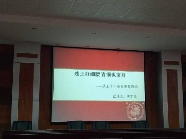 初夏五月,正值石榴挂红,栀子花开,微微夏风又送来端午粽香。中华民族的传统节日——端午节,马上就要来临。每逢端午,难免会使人想起屈原,想起璀璨的楚文化。相对于中原文化,楚文化是它的一个分支。这是一种浪漫的文化、一种恣肆蓬勃、亲近生命和自然的文化。为增进学生对楚文化的认知了解,管理工程学院特于2日下午于化学馆308举办楚文化历史讲座,中原历史文化宣讲团唐雯嘉老师受邀担任本次讲座主讲人。管理工程学院各年级同学参加了本次活动。 首先,唐雯嘉老师用中国地图的雄鸡造型切入话题,分析了不同思维方式体现出的不同审美观、价值观。细致恰当的切入点迅速吸引了同学们的视线,跟随着老师一同走进了楚文化异彩纷呈的世界。 从楚国源起到楚国发展,从荆楚风韵到灿烂文化,从王子午鼎到云纹铜禁,从王孙浩甬钟到青铜神兽,从信阳长台关楚墓到徐家岭楚墓,丰富多彩的楚文化激起了同学们强烈的好奇心,都沉浸在那个浪漫又充满奇思妙想的年代。唐雯嘉老师从造型之美、色彩之美、飘逸之风、浪漫无极又具有奇思异想的楚文化特点讲解了荆楚风韵。最后,唐老师向大家分享了楚人精神,即“筚路蓝缕”的开拓进取、艰苦卓绝;“抚夷属夏”的开放包容、博取众长;“一鸣惊人”的创新精神;“深固难徙”的爱国和乡土意识。讲座在同学们热烈的掌声中圆满结束。 “楚风遗韵在,千秋风流长”,极具浪漫主义气息的楚文化已被越来越多的人所了解重视,作为新时代的大学生,了解楚文化更为必要。通过本次讲座,培养了学生了解中国传统文化的兴趣,增强了学生的历史责任感与使命感,激励着同学们努力奋进,做一名合格的社会主义接班人。