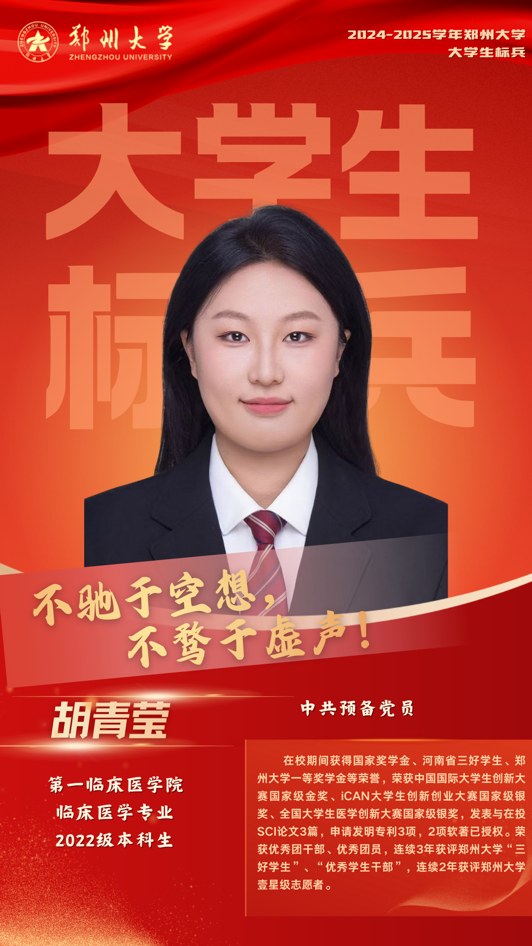 从课堂到实验室,从校园到基层,胡青莹的成长轨迹清晰而坚定。她用四年时间证明,所谓优秀,不过是把 “积累” 二字刻进日常:对学业的一丝不苟,让她筑牢行医根基;对科研的执着坚守,让她破解临床痛点;对他人的温暖关怀,让她彰显医者仁心。这些经历如同拼图,拼凑出她完整的成长图景,也印证着她的信念:医学之路,始于知识,成于技艺,最终的光辉与力量,源于对 “人” 的深刻理解与持久关怀。