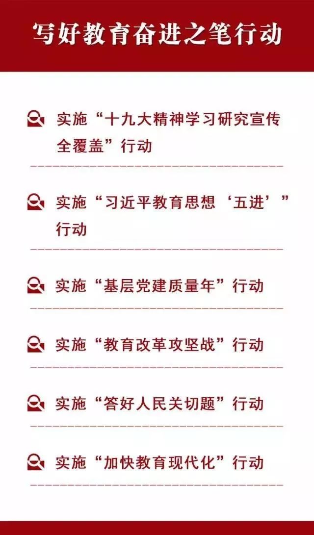 一是实施“十九大精神学习研究宣传全覆盖”行动,切实把教育系统领导干部和师生员工的思想行动统一到习近平新时代中国特色社会主义思想上来。