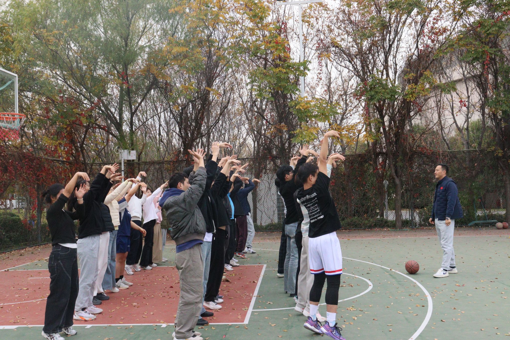 郑州大学运动与体育学院杨勇老师为选手提供现场指导。他带领全体选手进行关节活动、肌肉拉伸等热身运动,并示范投篮的站姿、握球手势、出手角度等技术要点。热身环节结束后,选手们分组进行了半小时分组适应性练习。比赛中,男子组选手与女子组选手依次在罚球线完成投射动作,投篮动作连贯。观赛师生在赛场周边为选手加油,欢呼声贯穿比赛全程,展示出了青年学生良好的精神风貌。经多轮竞技,2023级材料科学与工程学院徐瀚翔同学以“10投10中”的成绩获得本次比赛第一名。比赛结束后,刘红生与杨勇共同为获奖选手颁发荣誉证书及发放定制篮球、运动背包等奖品,并合影留念。