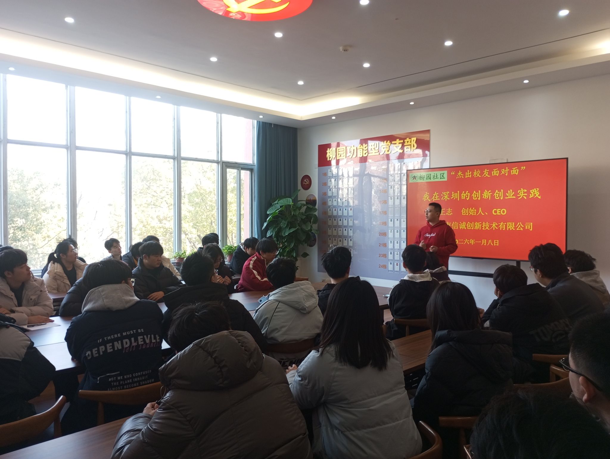 1月8日,由郑州大学柳园社区主办、电气与信息工程学院承办的“杰出校友面对面”活动在柳园社区205活动室成功举办,特邀深圳市信诚创新技术有限公司创始人、CEO、我校电气与信息工程学院2002级校友王志作专题报告,活动由柳园社区负责人主持,电气与信息工程学院本科生代表60余人参加。