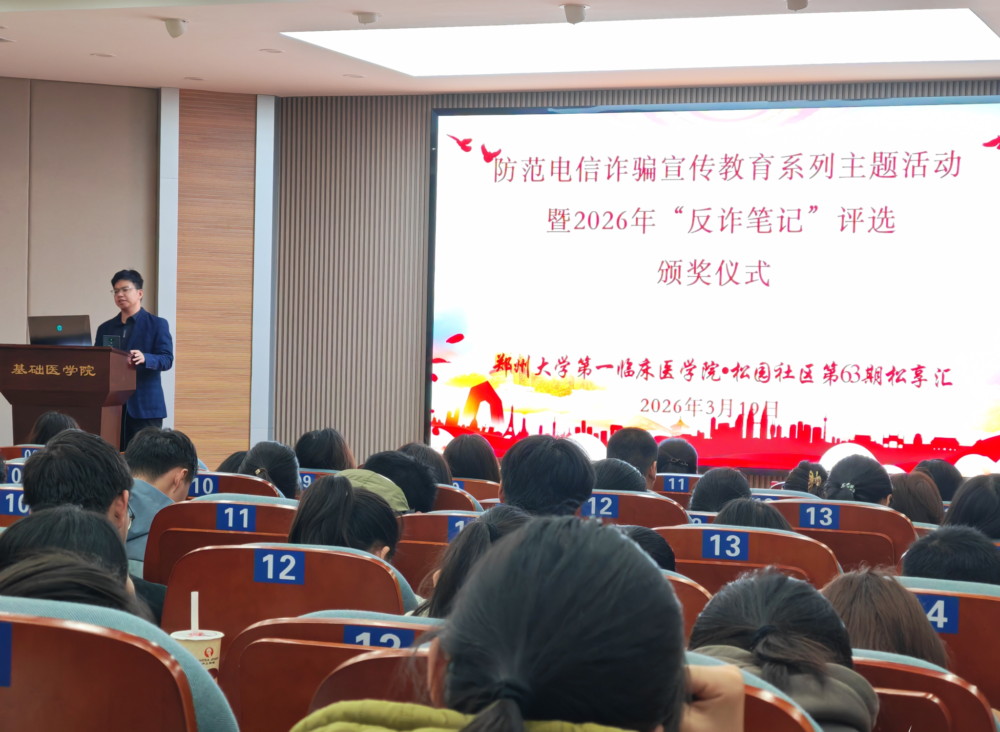 3月19日,郑州大学松园社区与第一临床医学院联合举办“松享汇”第63期——反诈宣传教育主题活动暨“反诈笔记”评选颁奖仪式。第一临床医学院党委副书记崔超出席并讲话。