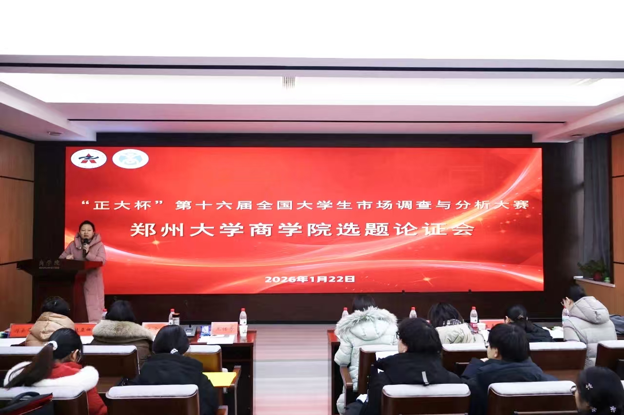 2026年1月22日,郑州大学商学院第十六届全国大学生市场调查与分析大赛本科组主题论证会在院办一楼学术报告厅举行。商学院党委副书记、纪委书记王传芳,金融系主任刘霞,学科竞赛主管、金融系副教授王磊玲,商学院团委副书记郭英杰,大赛指导教师左宇晓、杜亚娜、游云泽等担任论证会评委,共计五十支本科参赛队伍齐聚现场,共话调研思路,共研实践方向。王传芳在致辞中指出,全国大学生市场调查与分析大赛是检验商科学生专业素养...