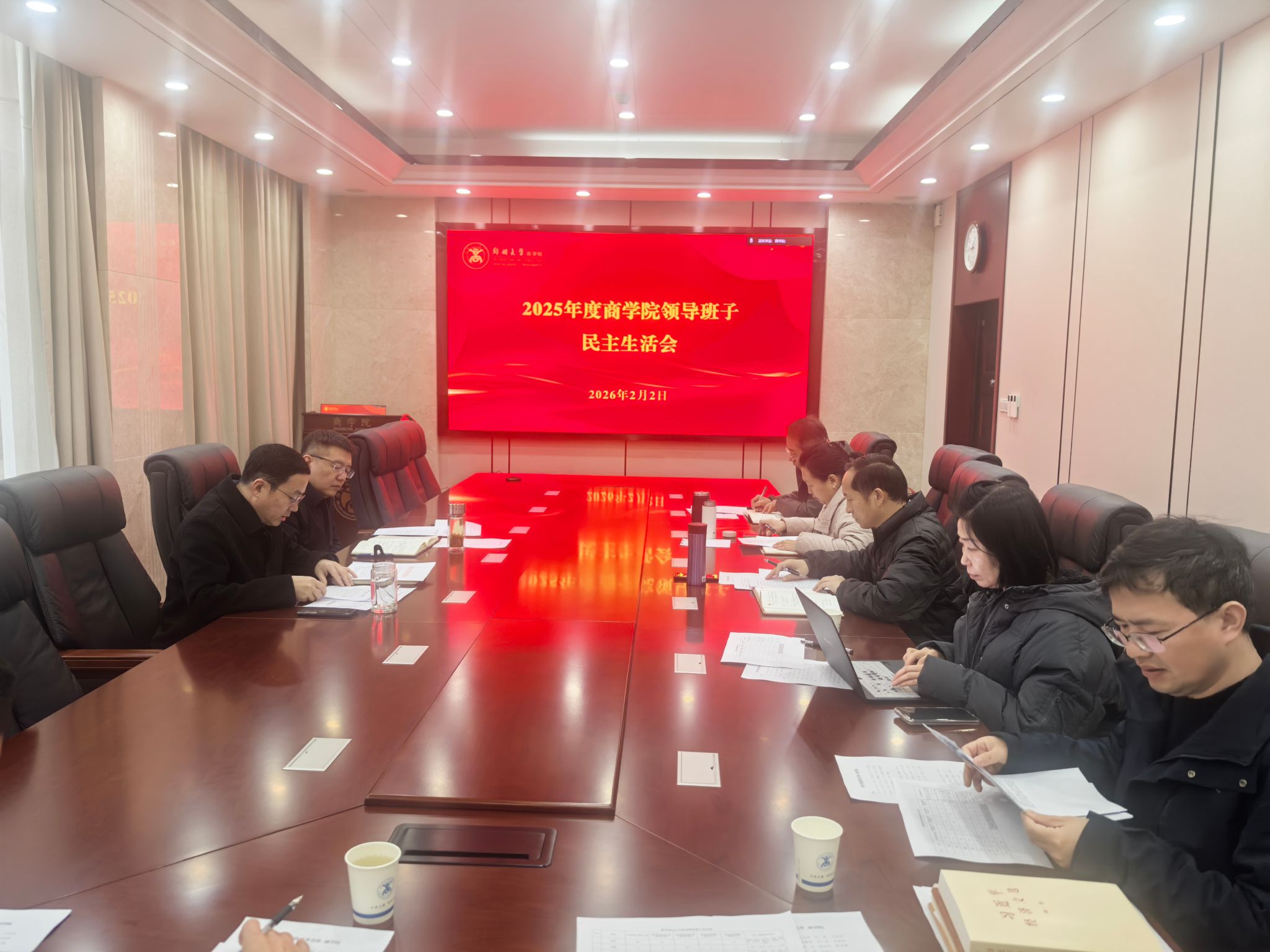 2026年2月2日,商学院召开2025年度领导班子民主生活会。会议严格落实校党委相关通知要求,紧扣主题、围绕“五个带头”查摆方向,深入开展对照检查与批评和自我批评。学院党员领导班子成员参加会议,党外领导班子成员列席会议,会议由党委书记魏忠主持。会前,同志们扎实开展集中学习与个人自学,结合巡察反馈问题、师生意见及典型案例深入查摆;广泛征求师生代表等意见建议,坦诚开展谈心谈话,认真撰写对照检查材料,为会议召...