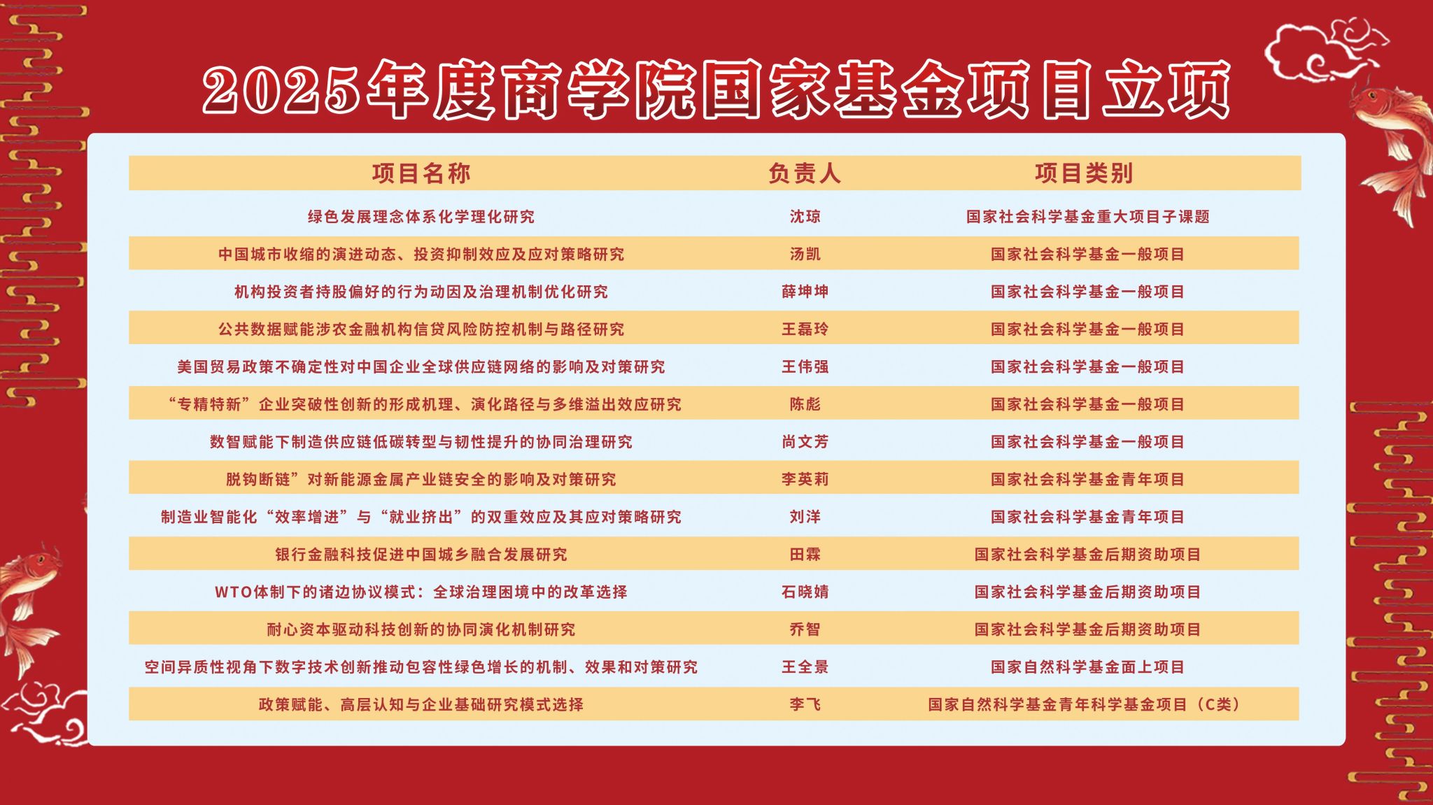 近日,全国哲学社会科学工作办公室公示了2025年国家社会科学基金后期资助暨优秀博士学位论文出版、优秀学术著作再版项目立项名单,郑州大学商学院获批国家社会科学基金后期资助项目3项。项目名称负责人项目类别银行金融科技促进中国城乡融合发展研究田霖国家社会科学基金后期资助项目WTO体制下的诸边协议模式:全球治理困境中的改革选择石晓婧国家社会科学基金后期资助项目耐心资本驱动科技创新的协同演化机制研究乔智国家社会...