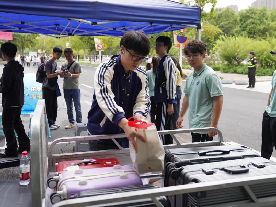 院内报到点志愿者专业高效、耐心指引;行李搬运组全程跟踪,贴标分类、三轮转运、定点看管,实现行李“无遗漏、零错件”,守护新生从容迈出独立第一步。