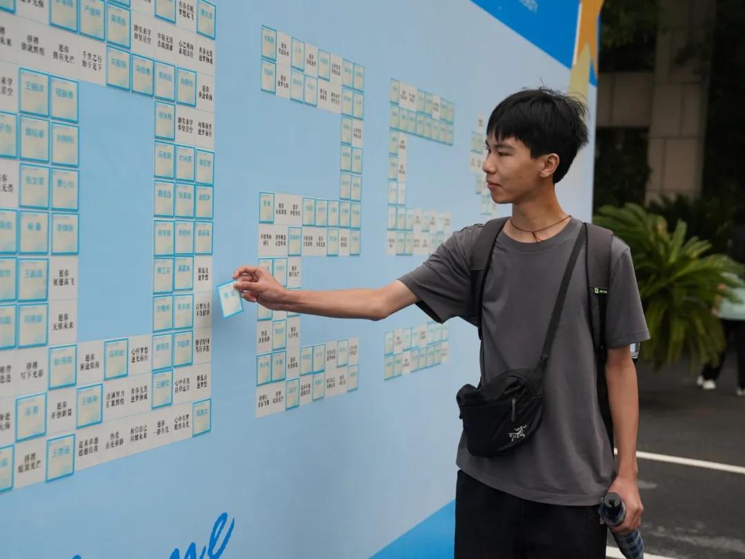 互动桁架上303块定制亚克力姓名贴构成一道温情的风景。每一张姓名下方藏有一句专属祝福——新生以“开盲盒”方式“找自己”,每一张姓名贴均由学长学姐亲手粘贴,商学院的精神传承就此展开。