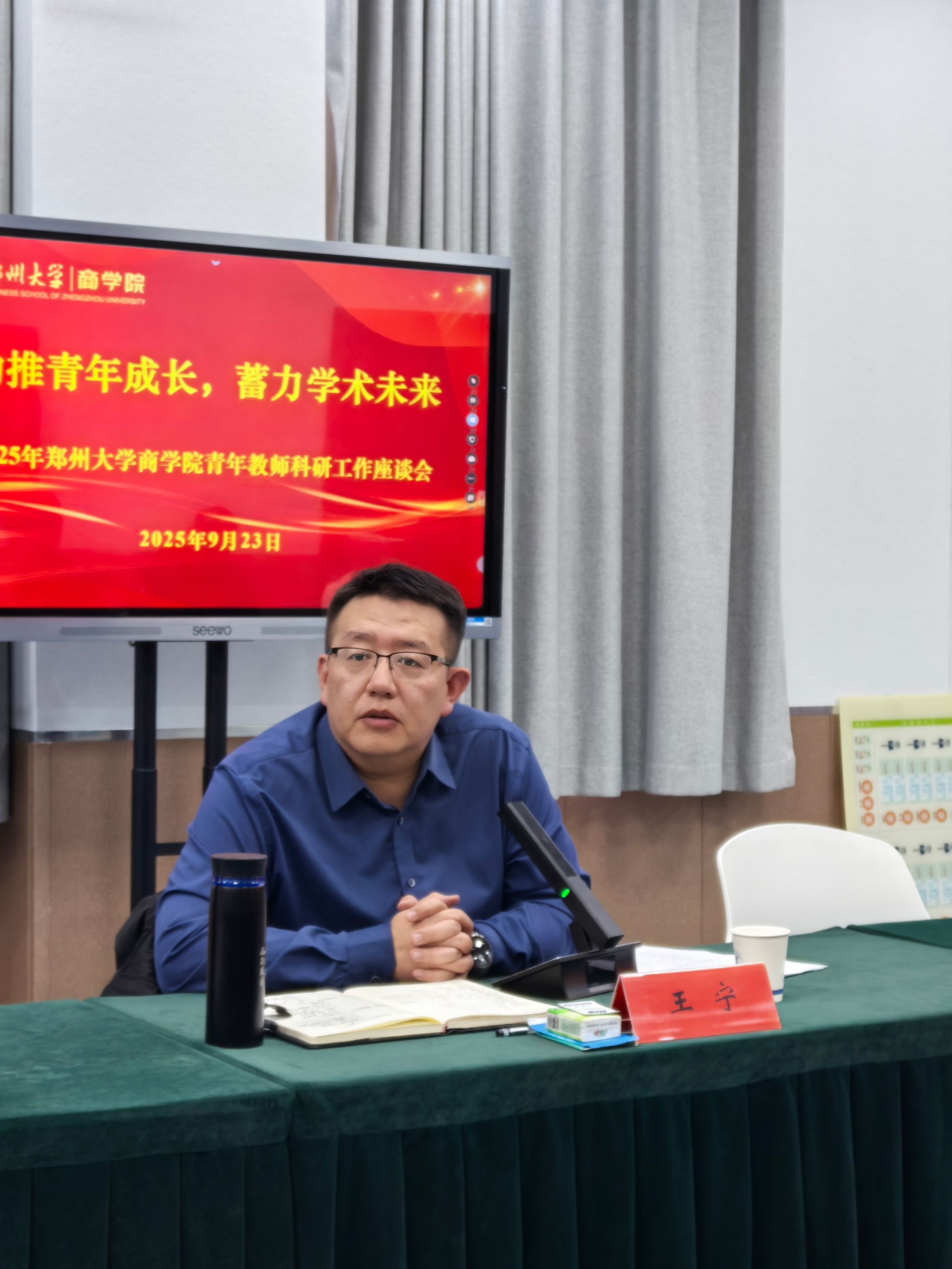 9月23日下午,商学院召开“助推青年成长,蓄力学术未来——2025年郑州大学商学院青年教师科学工作座谈会”。商学院党委书记魏忠,执行院长、党委副书记王宁出席并发表讲话,座谈会由副院长汤凯主持。