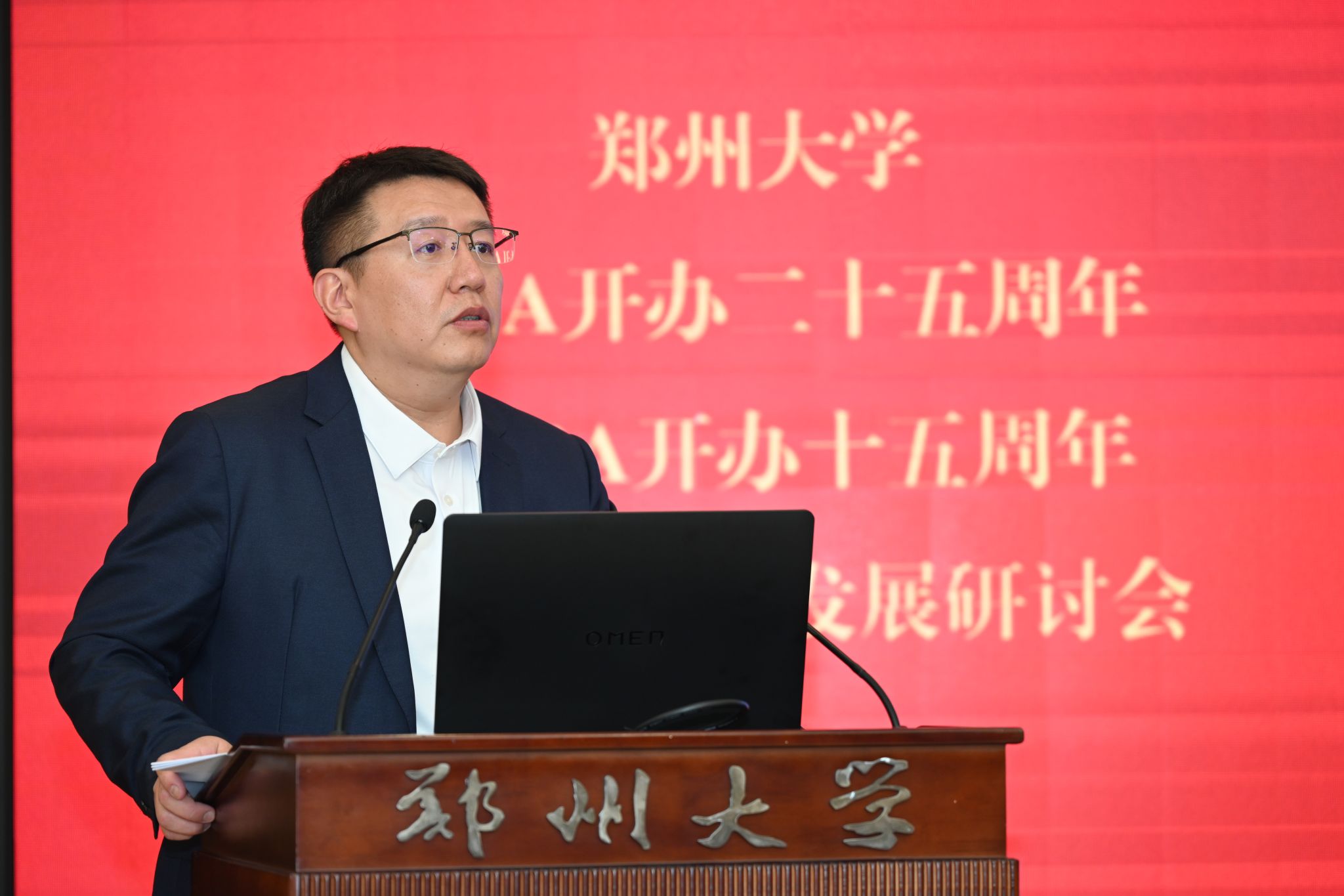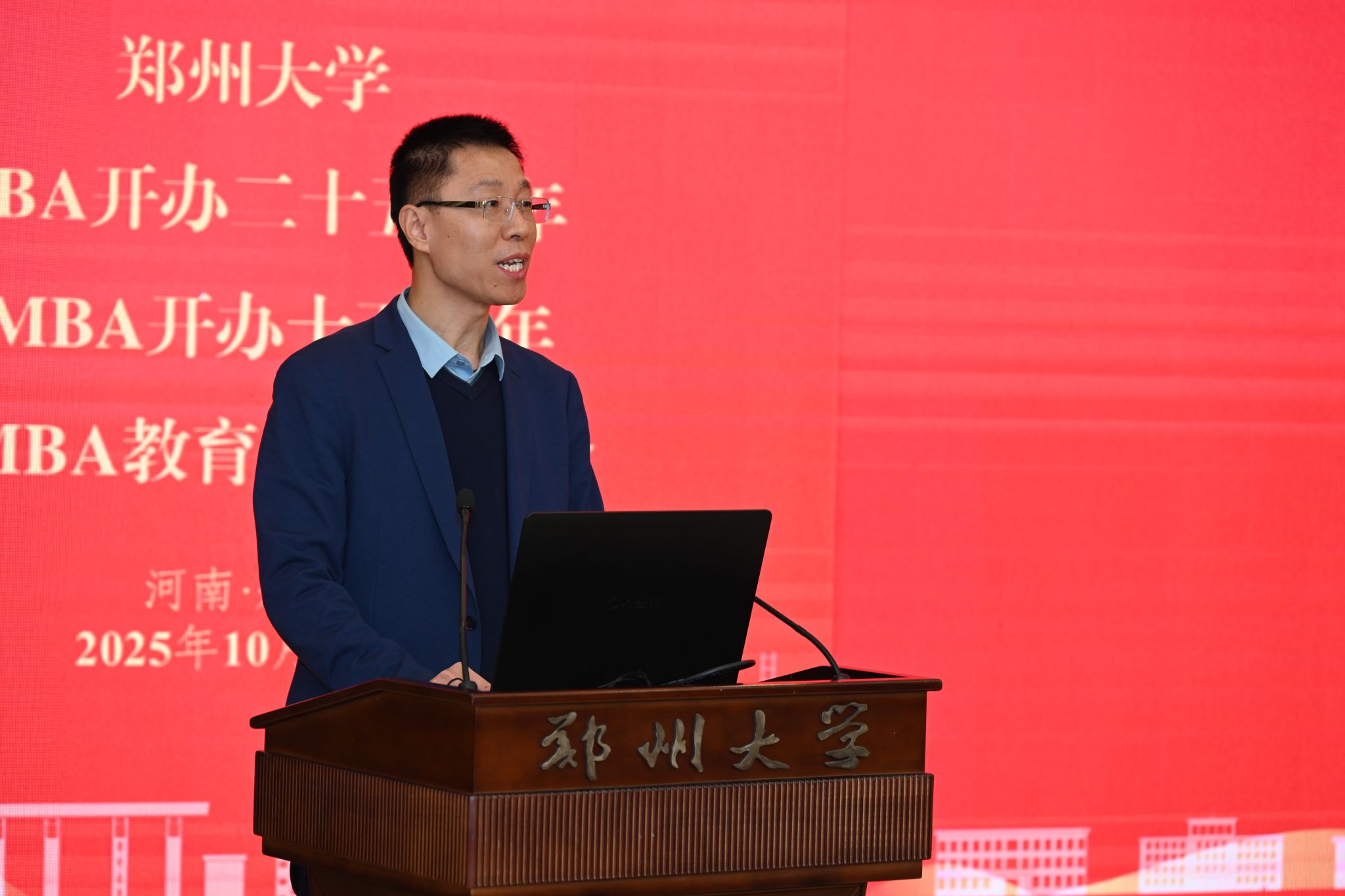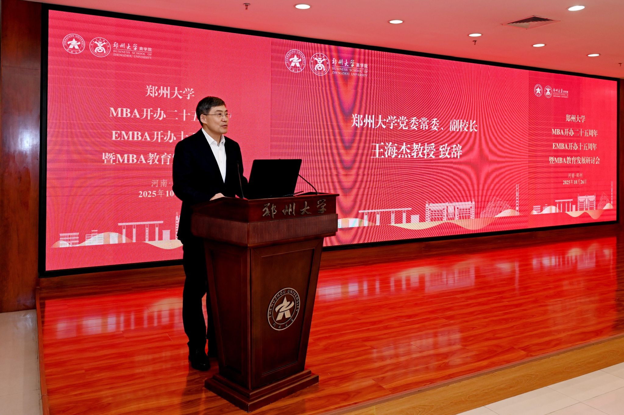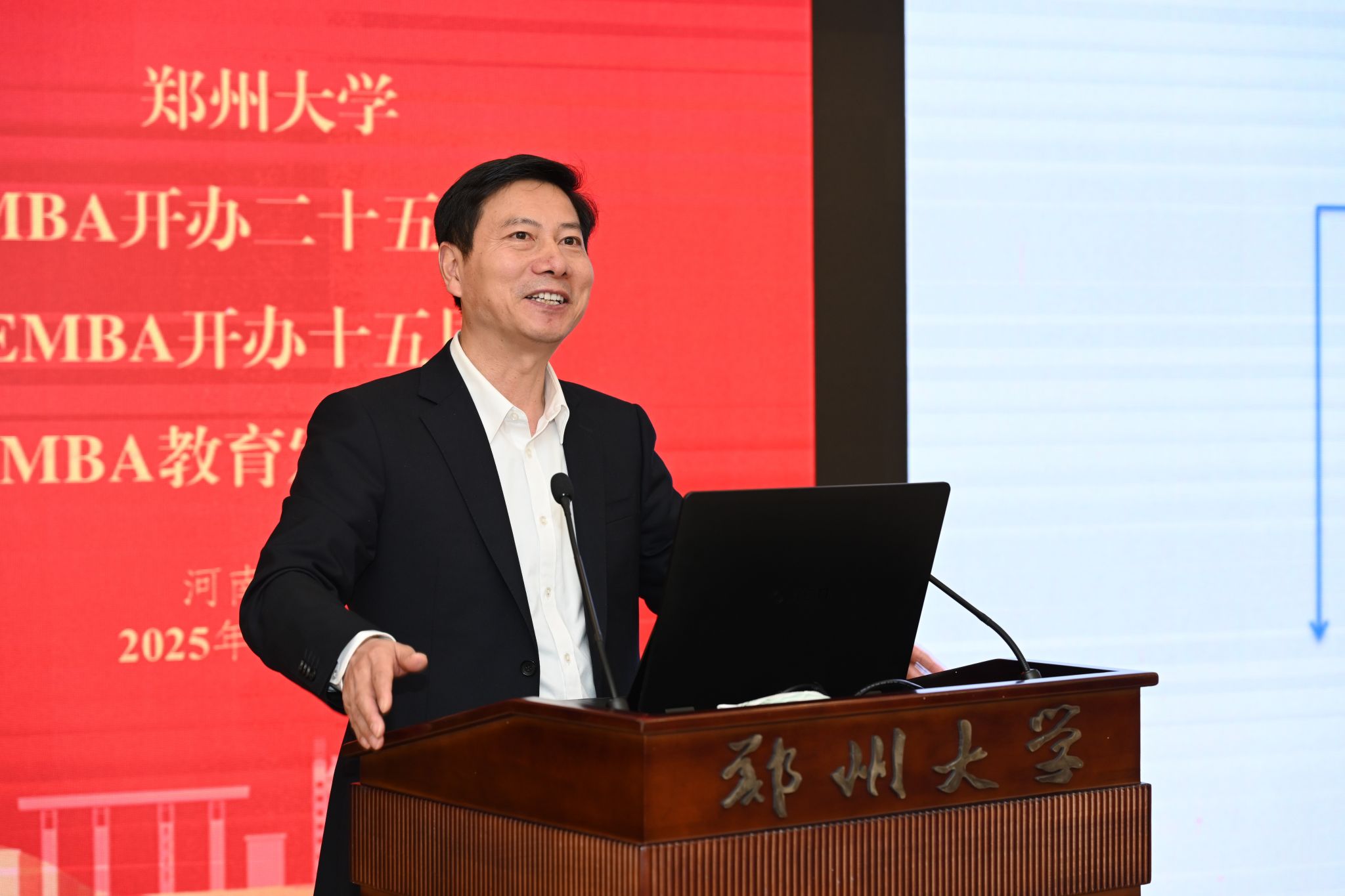 王海杰致辞。他回顾了郑大MBA/EMBA教育二十五年沉淀与十五年精进的发展历程。他指出,项目自开办以来秉承“弘道立德,经世济民”办学使命,致力于“锻造行业领袖,助推学员成功”,构建了“扎根实践、知行合一”的培养模式,锻造了“博学专精、亦师亦友”的师资队伍,凝聚了“价值共创、守望相助”的校友网络,树立了“服务社会、勇于担当”的家国情怀,为河南乃至全国经济社会发展培养了一大批复合型高层次经营管理人才;未来必将继续为民族复兴贡献更多更大的“郑大力量”。
