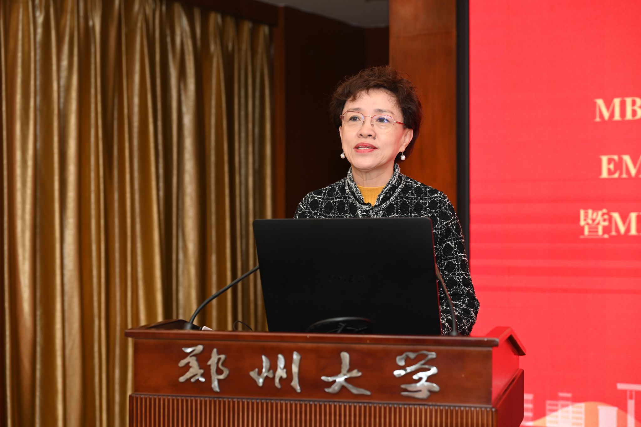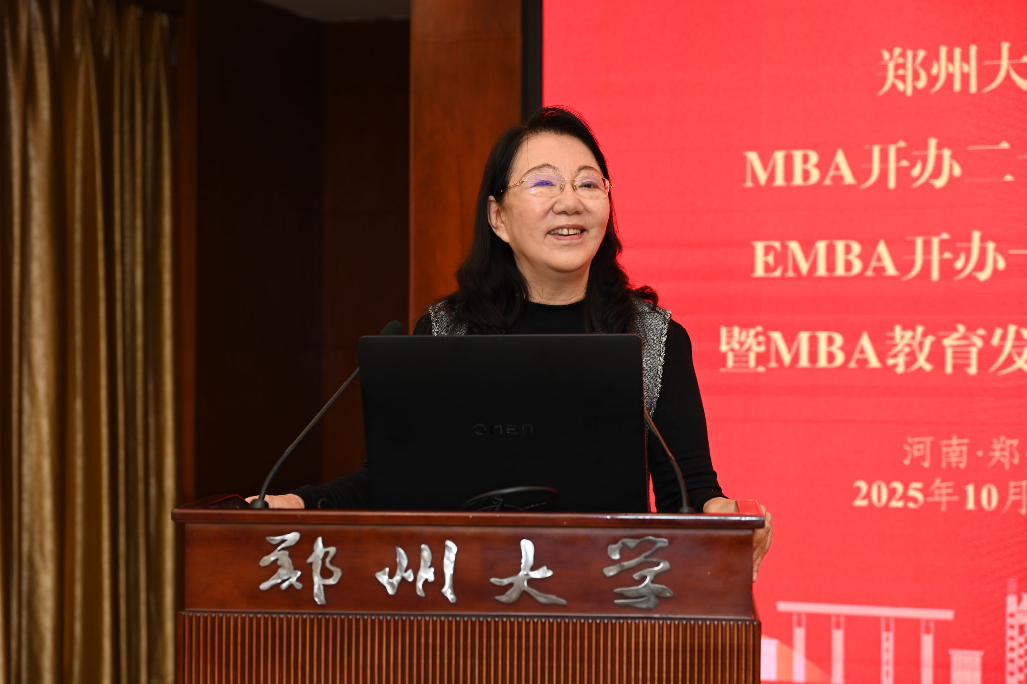 王萍致辞。她回顾了中国MBA教育34年的发展历程,作为郑州大学MBA/EMBA教育项目发展的见证者,肯定了郑州大学MBA教育项目二十五年来“筚路蓝缕,以启山林”的开拓精神以及在办学特色、教育质量和品牌建设方面取得的成就,并祝愿郑州大学MBA教育再创辉煌,为中国商科教育开启新的篇章。