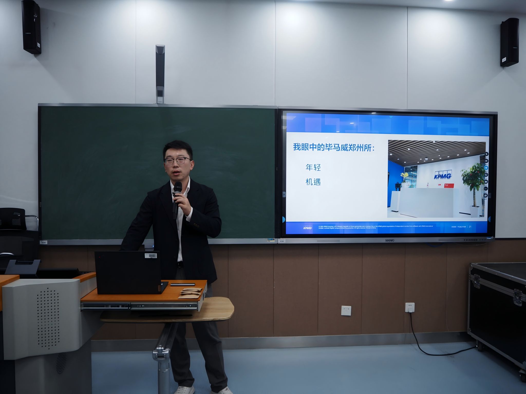 赵昕楠在宣讲会上系统介绍了毕马威中国的业务架构与校园招聘标准,为学生构建了清晰的企业认知框架。赵壹从管理者视角分享了公司在人才梯队建设与企业文化塑造方面的实践成果,并结合实际案例阐释了人才培养理念。周硕就学生关心的审计岗位核心能力、跨专业求职及实习适应等问题作出专业解答。