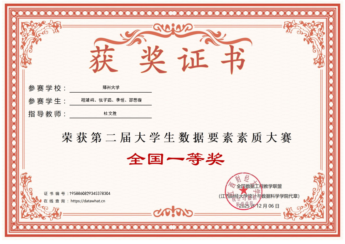 近日,2025年(第二届)全国大学生数据要素素质大赛在江西财经大学圆满落幕。我院代表郑州大学参赛并取得佳绩:1支本科生队伍荣获全国一等奖,我校荣获优秀单位组织奖和优秀赛区组织奖。