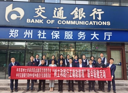 4月10日下午,郑州大学商学院党委与交通银行郑州中原中路支行党支部开展“树立和践行正确政绩观”主题联学联建暨党建共建活动。郑州大学商学院党委书记魏忠,副院长、工会主席李琴英,金融系教工党支部书记陈力朋,金融系主任刘霞,金融系副主任谢明明,金融硕士项目主管罗兴和金融系党支部纪检委员何奇龙等教师代表参加活动。交通银行郑州中原中路支行党支部书记、行长杨广军,支行党员代表及商学院在交行系统工作的优秀校友代表共同参会。