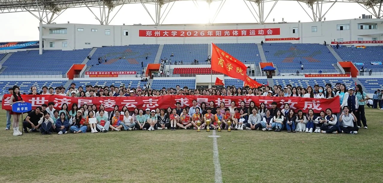 4月9-11日,郑州大学2026年阳光体育运动会在主校区本源体育场举行。在本次运动会中,商学院师生团结拼搏、顽强奋进,最终取得了学生男子组团体总分第一名、学生女子组团体总分第二名、教工组团体总分第六名的优异成绩,同时获得了大会“优秀仪仗队奖”和“体育道德风尚奖”。
