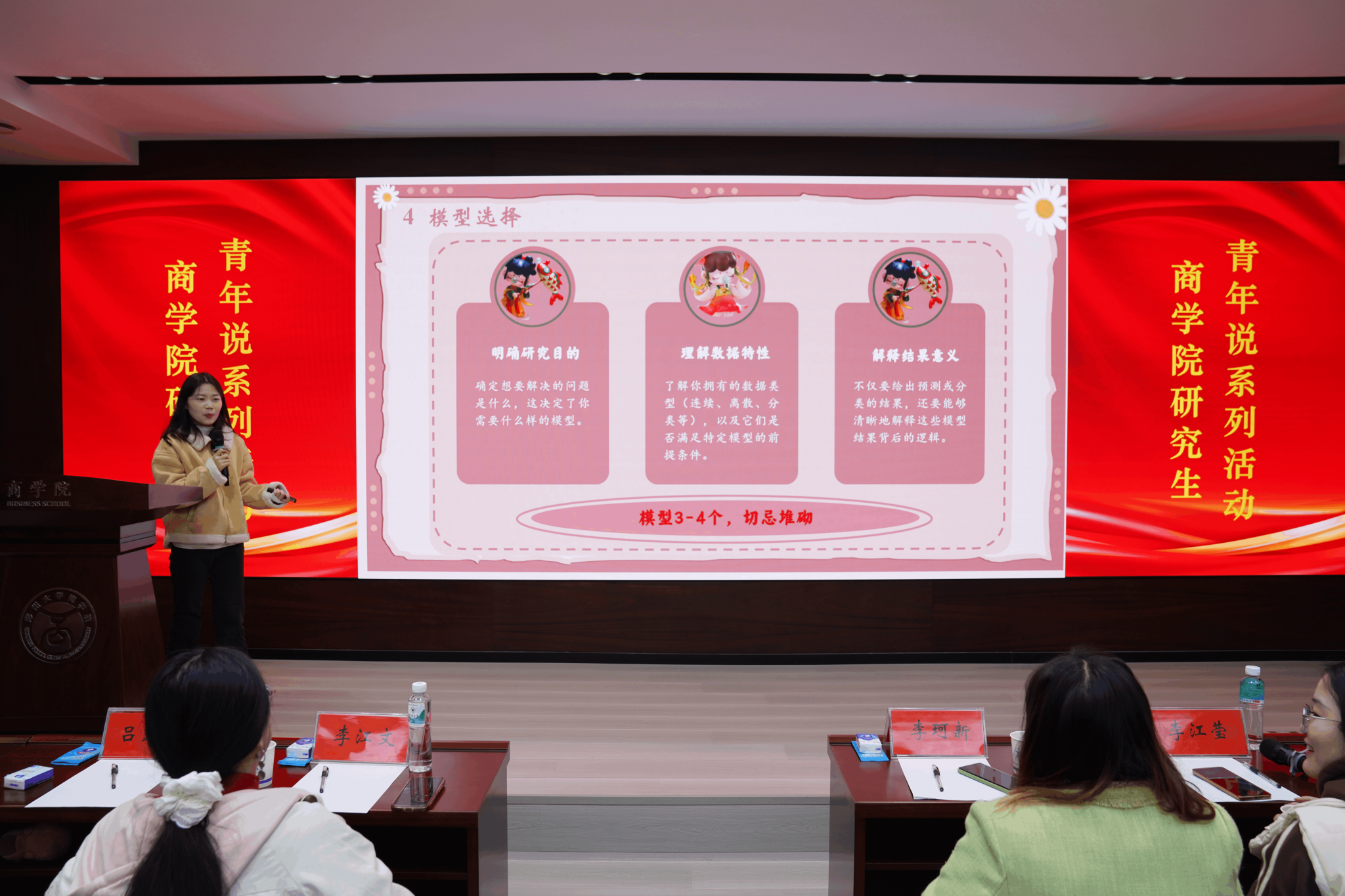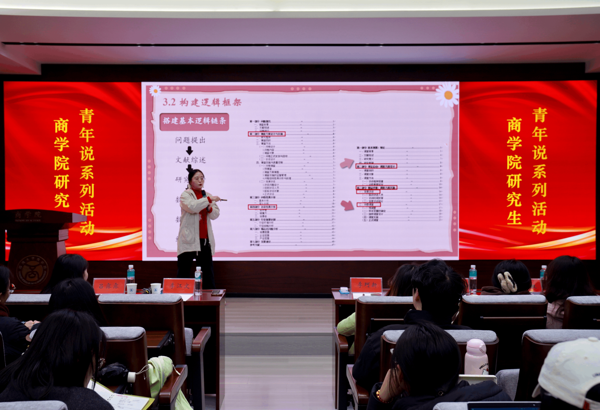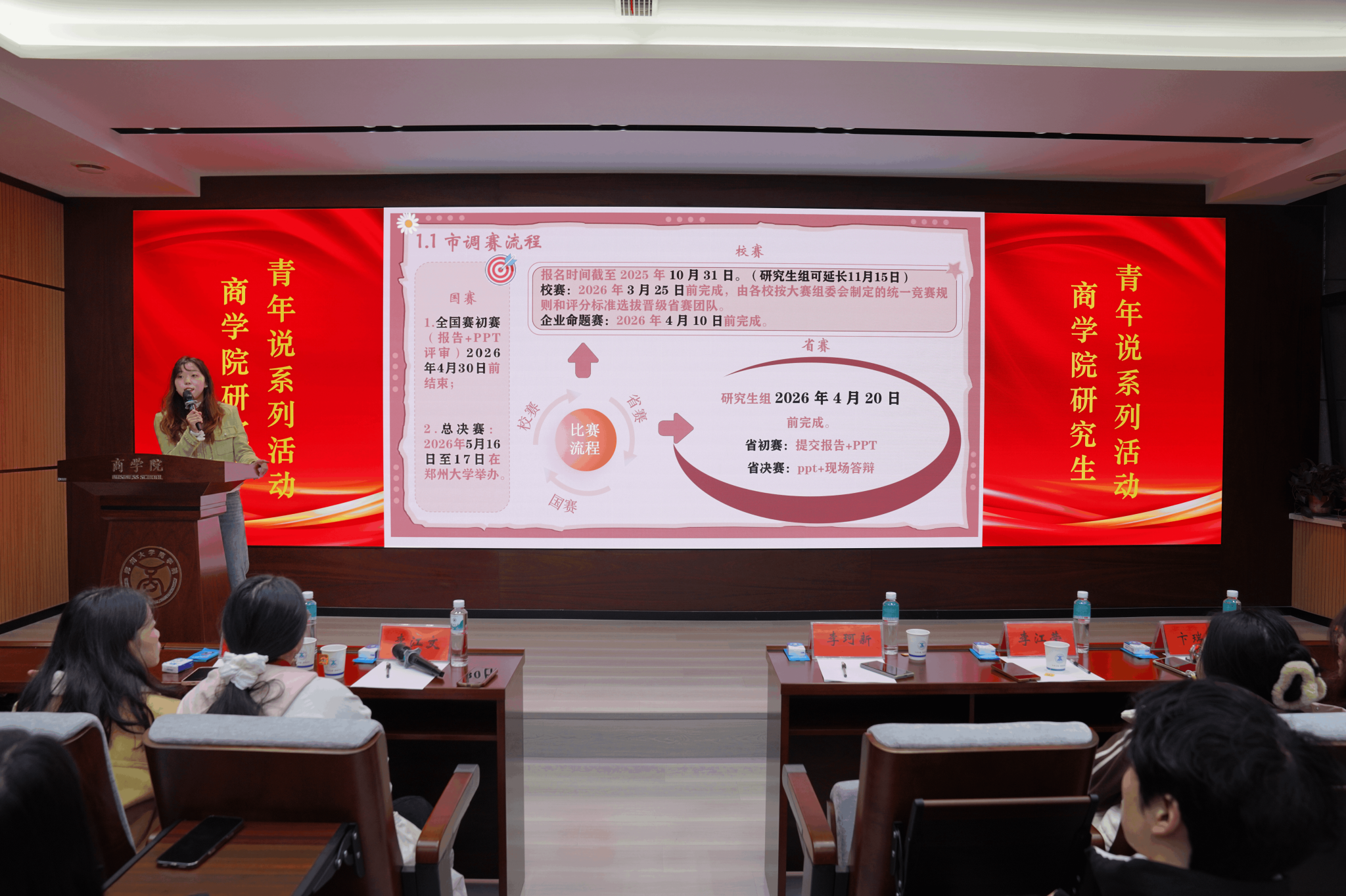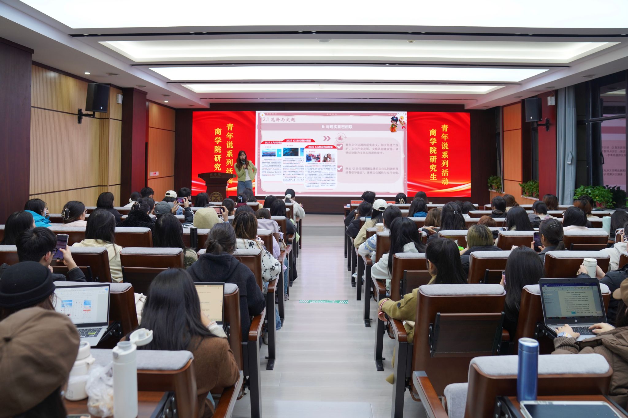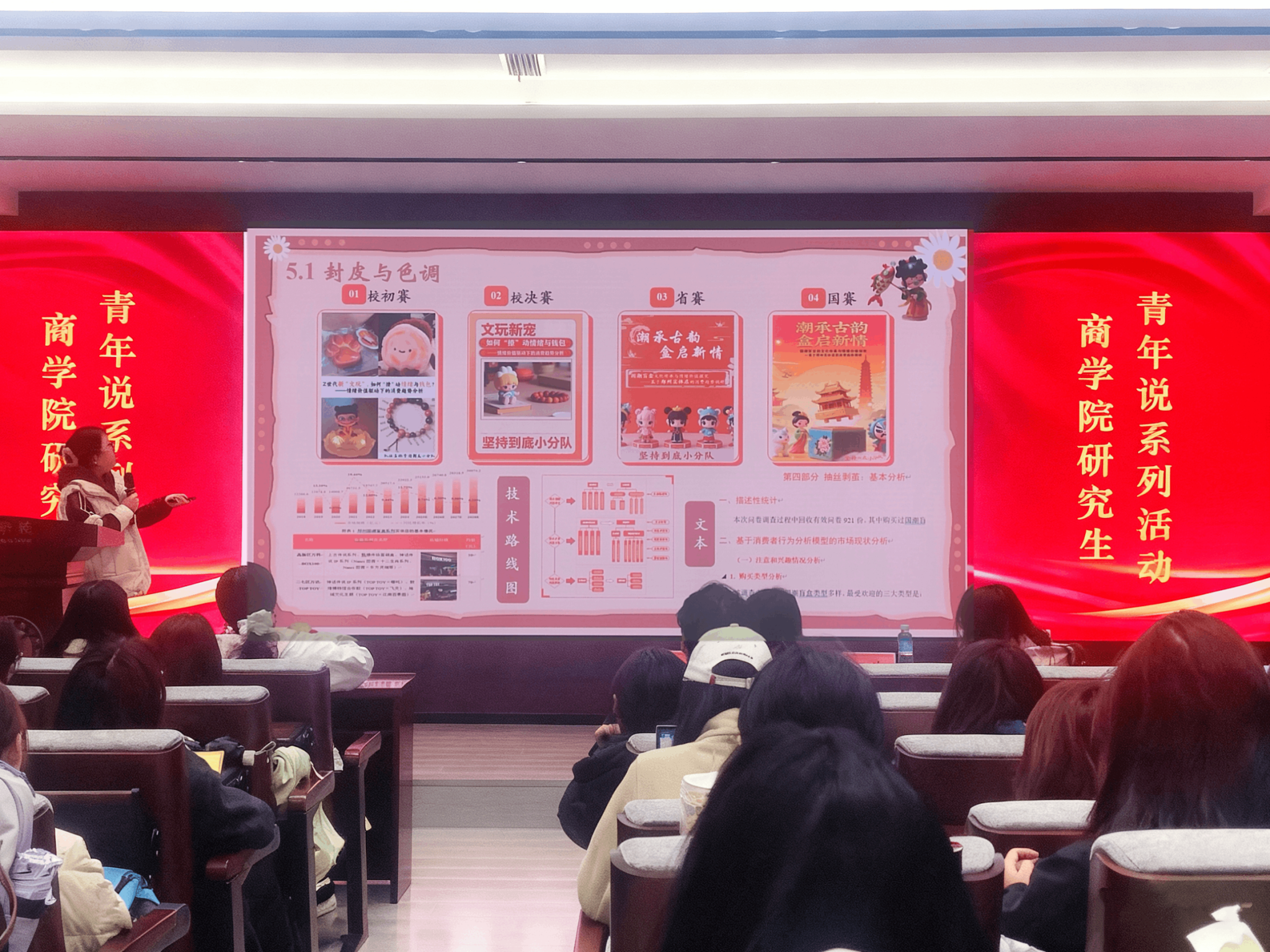 10月20日晚,第八期“红色青春,研途榜样”商院青年说系列活动于商学院102报告厅举行。本次活动特邀我院在第十五届全国大学生市场调查与分析大赛中荣获国家级一等奖的“坚持到底小分队”,围绕市调赛参赛流程与实战技巧展开经验分享。研究生辅导员卞瑞敏及2025级全体研究生共同参会。