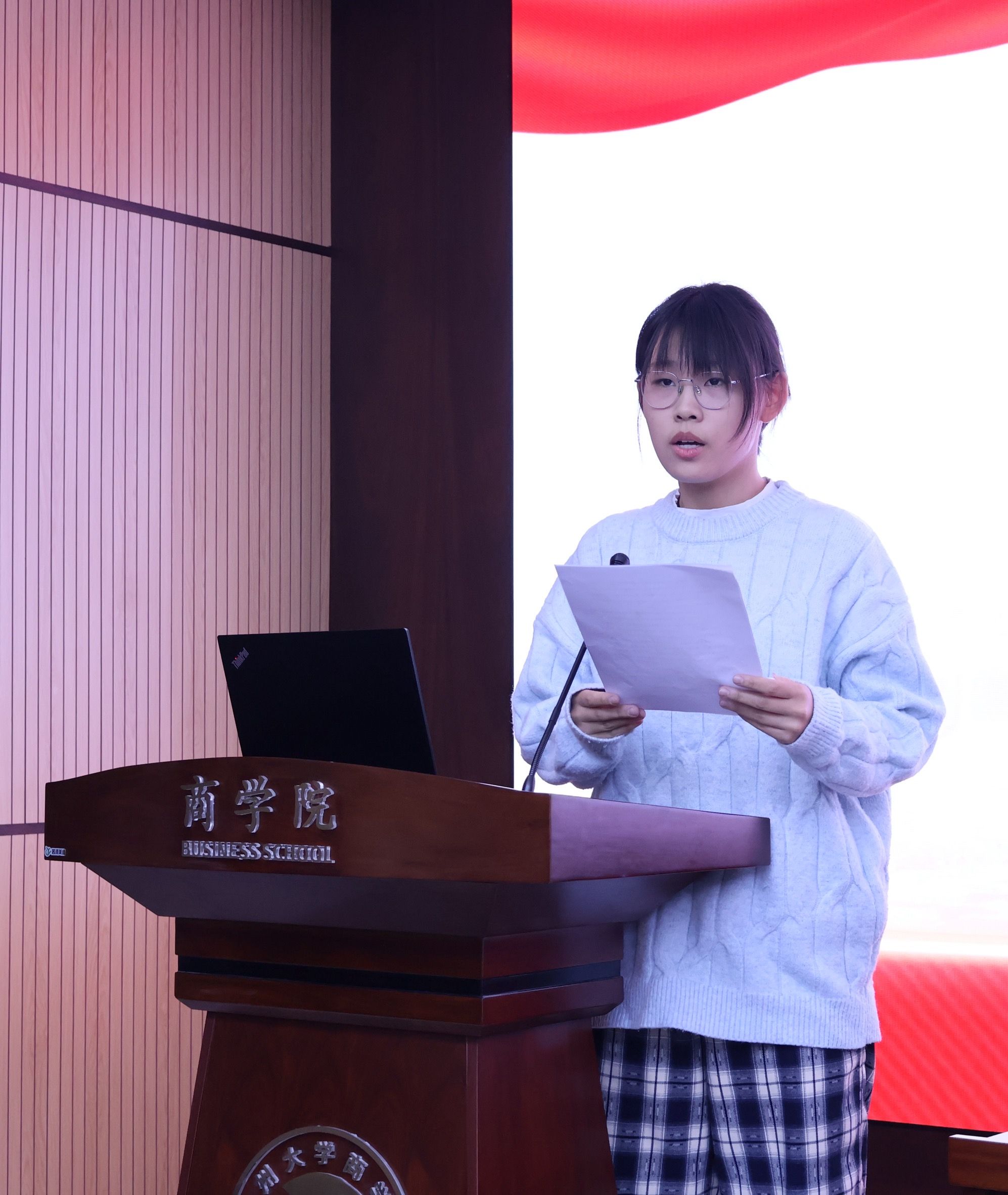 学员代表2024级董沐青发言。她结合观看九三阅兵的感悟,表达了对党的光辉历程和党员先锋事迹的崇敬之情。她表示,将以空杯心态全身心投入学习,深悟党的理论精髓;以党员标准严格要求自己,严守培训纪律,展现积极分子良好形象;坚持学以致用,把学习成果转化为服务社会的实际行动,努力践行“请党放心,强国有我”的青春誓言。