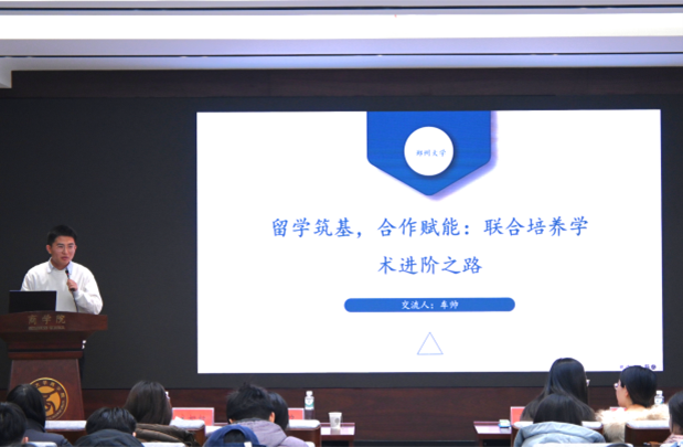 为锚定学校“双一流”建设中国际化高层次人才培养目标,搭建出国出境联合培养研究生经验共享平台,进一步促进联合培养工作机制,12月4日下午,我院举办商学院研究生联培经验分享会。会议邀请学院经济学系初聘副教授车帅、工商管理系直聘副研究乔佩蕊两位老师作联培经验分享。学院副院长江求川,研究生办主任宋姗姗,研究生辅导员卞瑞敏出席会议。本次会议由江求川主持,100余名研究生参加会议。