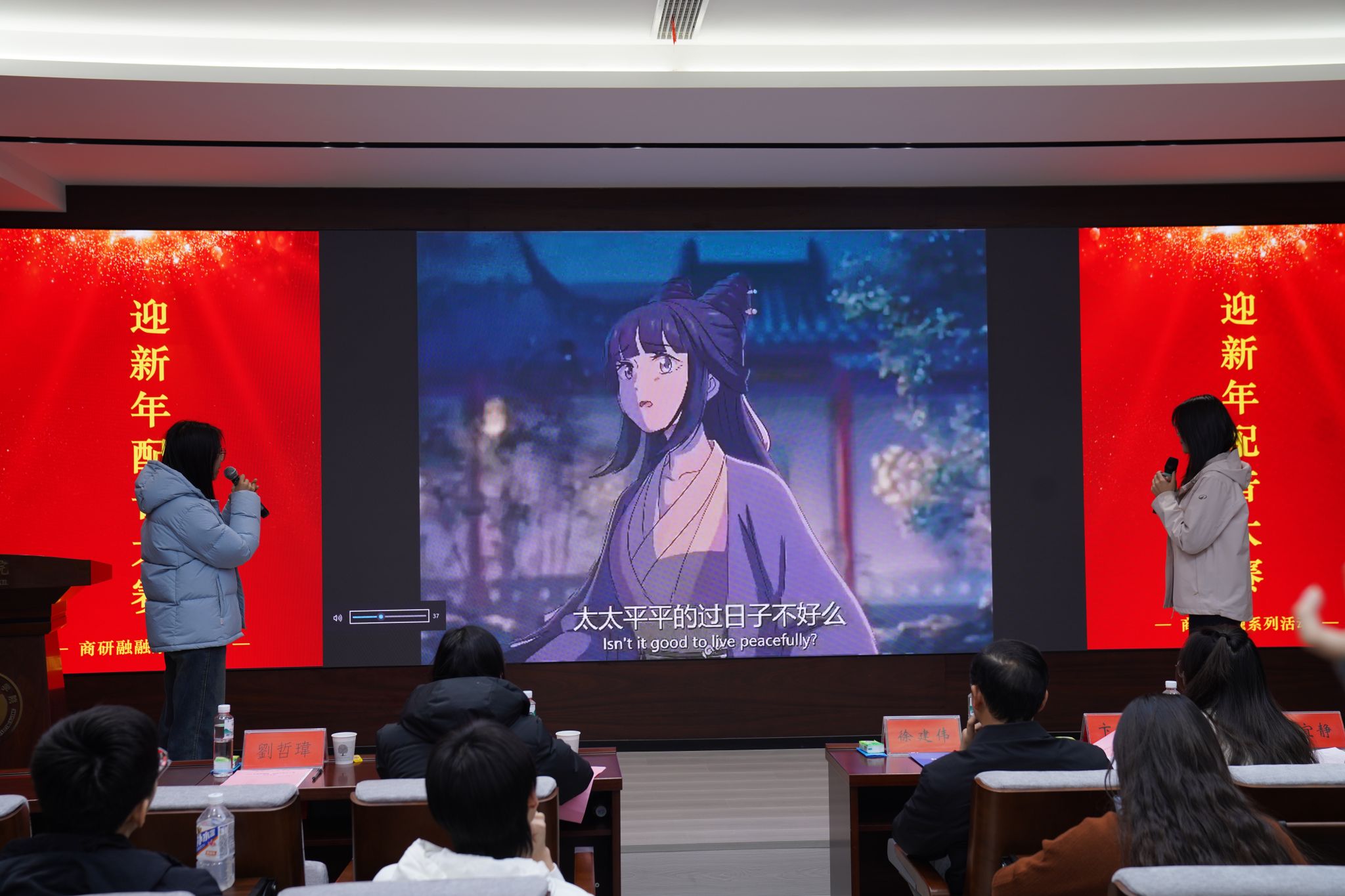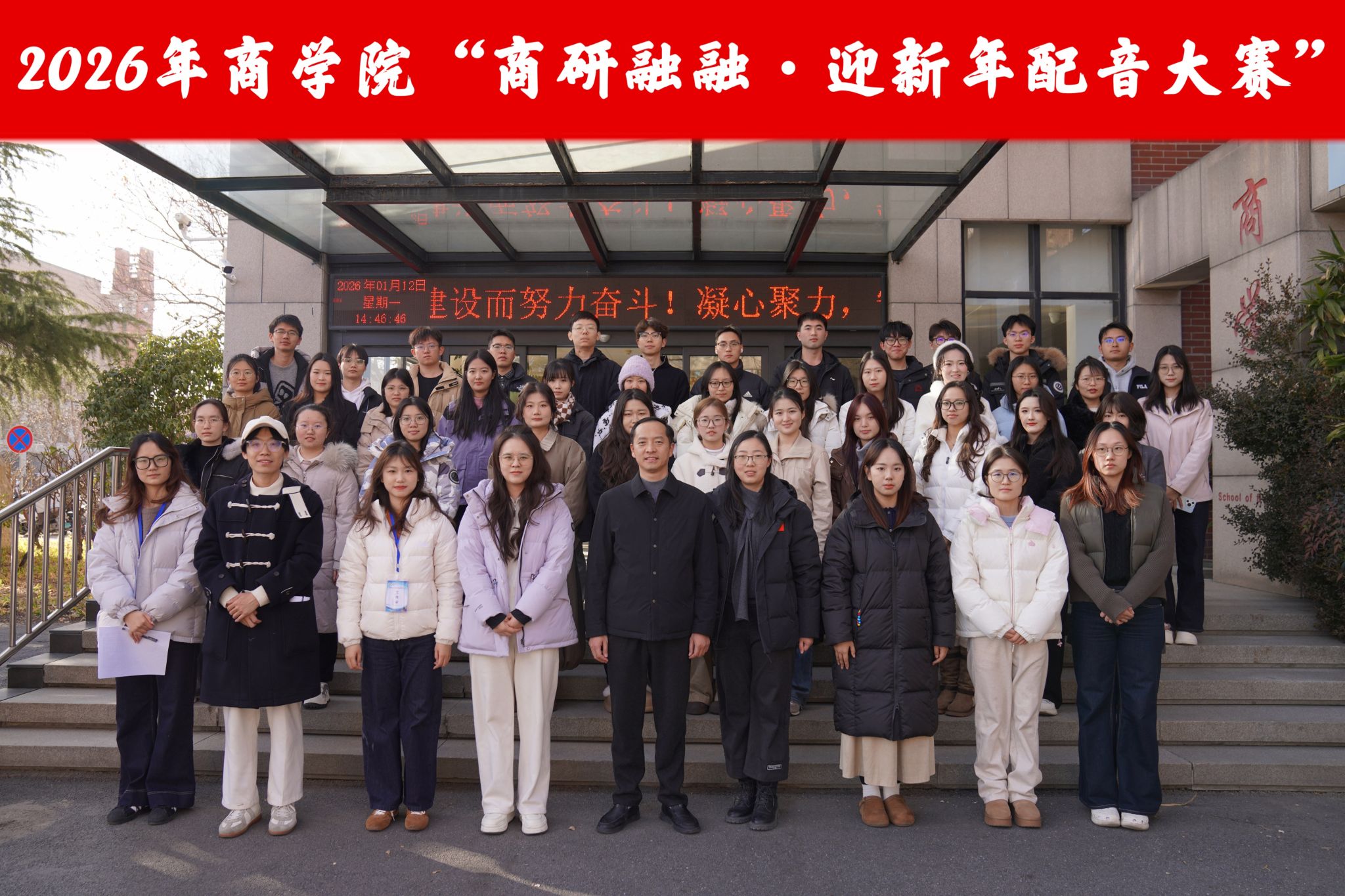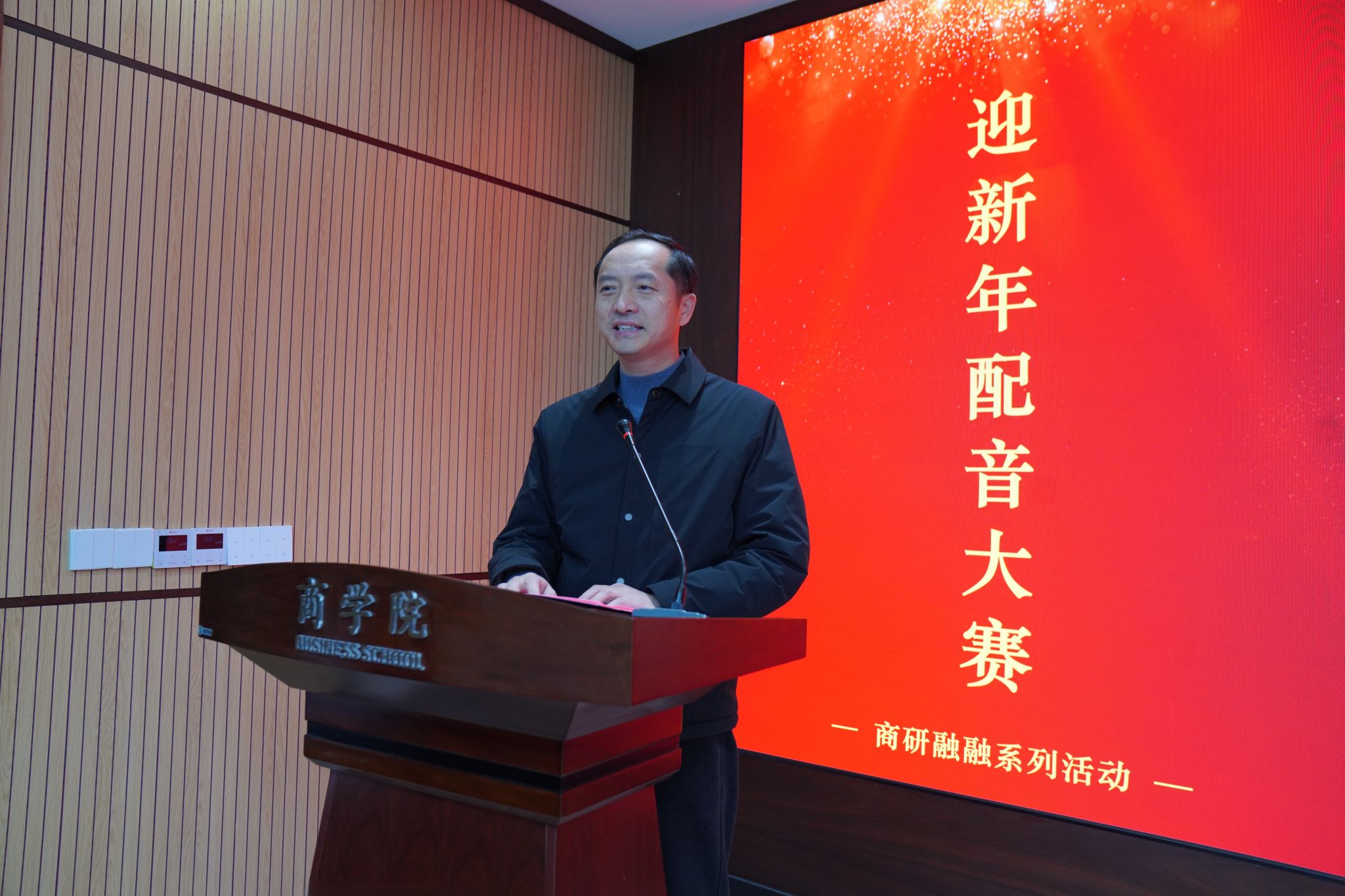 1月12日,由我院研究生会策划举办的商研融融・迎新年配音大赛在学院一楼学术报告厅举行。院党委副书记徐建伟,研究生办主任兼辅导员宋姗姗、研究生辅导员卞瑞敏出席活动,12支参赛队伍报名参赛。