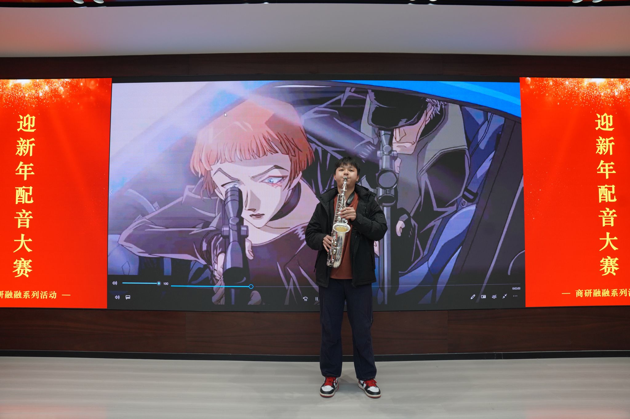 徐建伟为大赛致开幕词。他指出,配音不仅是语言艺术与创意的结合,更是诠释经典、传递情感的有力方式,希望同学们通过声音演绎展现才华,在创新表达中涵养文化情怀,彰显商学院学子的青春活力。随后,12支参赛队伍依次登场,呈现了形式多样、内容丰富的配音作品,既有《花木兰》《西游记》等经典影视片段的重现,也有《甄嬛传》科研版等贴近校园生活的幽默改编。选手们凭借生动的演绎和默契的配合,赢得现场阵阵掌声。闭幕表演特邀材料学院本科生劉哲瑋带来萨克斯独奏,为现场增添了轻松愉悦的艺术氛围。经评选,大赛最终产生一等奖2组、二等奖2组、三等奖8组。
