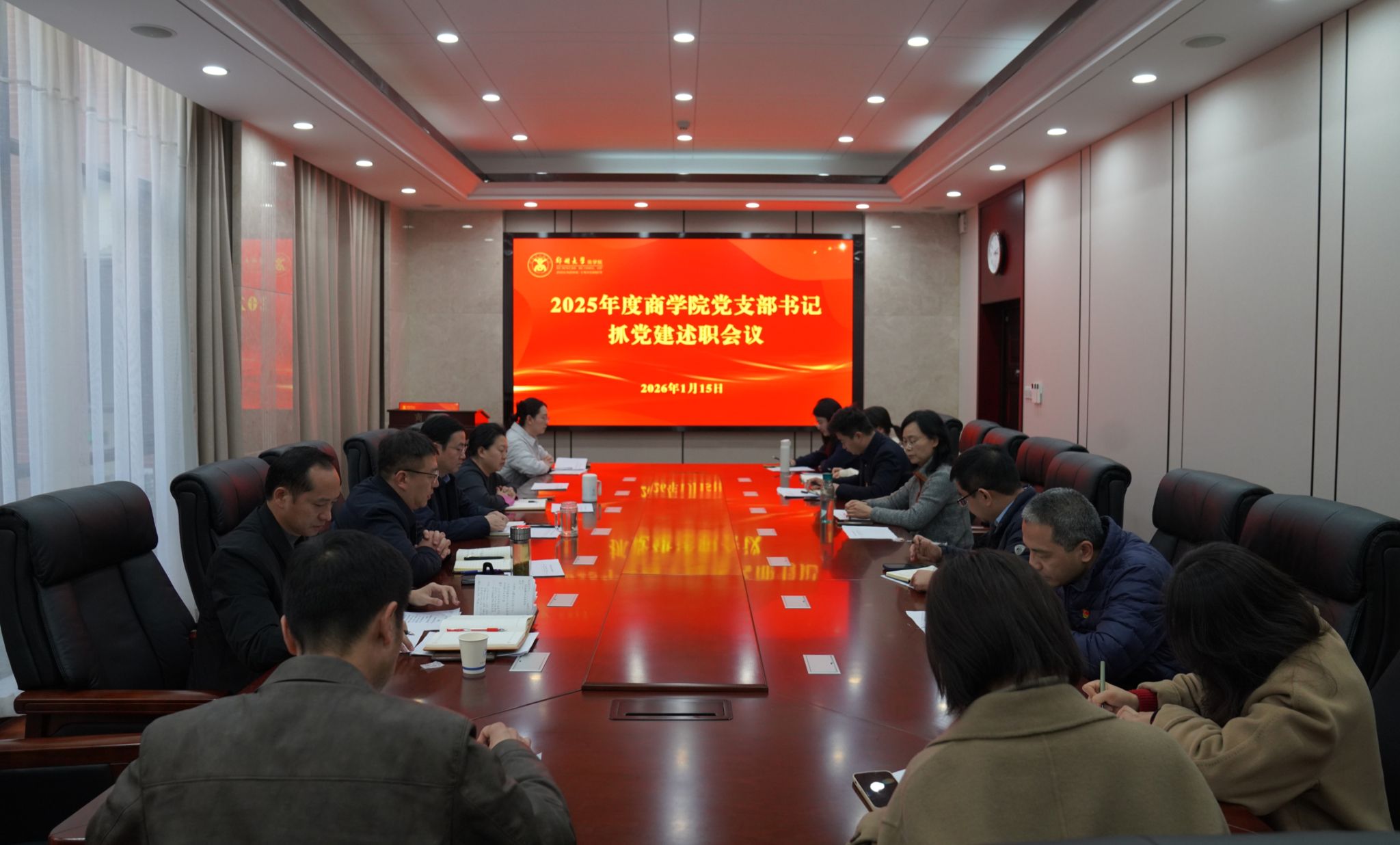 1月15日下午,商学院党委召开2025年度教工党支部书记抓党建工作述职评议考核会议,院党委书记魏忠主持会议并讲话。院党委副书记王宁、王传芳、徐建伟等出席会议,各教工党支部书记参加会议,各学生党支部书记列席会议。