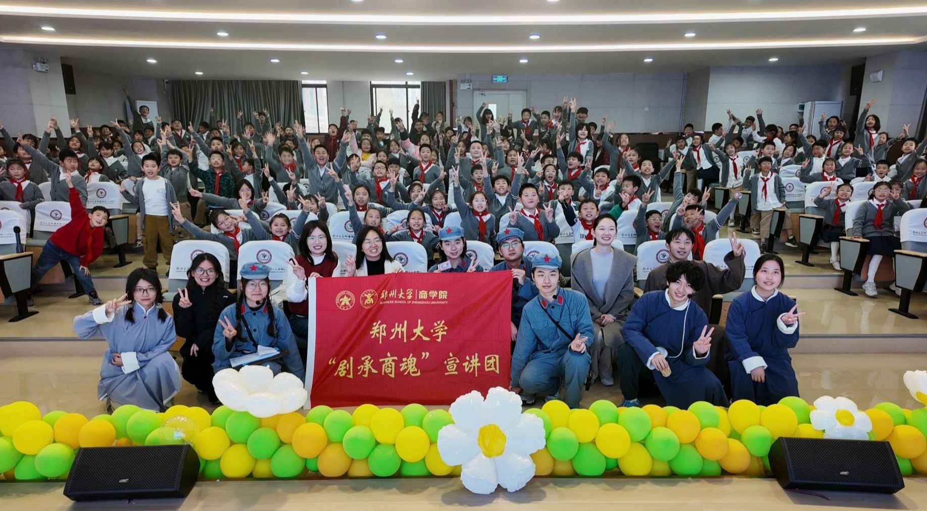 为厚植爱国主义情怀,培育社会主义核心价值观,普及金融诚信知识,3月26日下午,郑州大学商学院“剧承商魂”宣讲团携原创话剧《信用之火:人民金融的黎明》,走进郑州大学附属学校(小学部)开展专场展演。宣讲团由学院青年志愿者协会志愿者组成,商学院团委副书记郭英杰、统计学系副教授张晓昱、本科生辅导员卢家昕等参加活动。