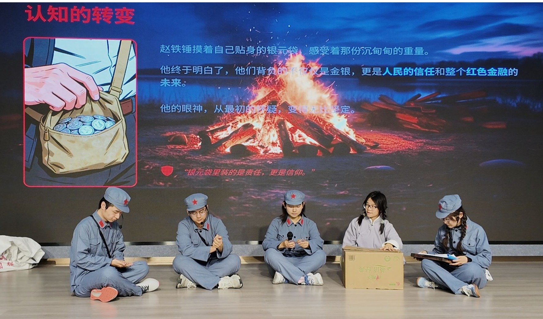 舞台上,参演学子深情演绎、情绪饱满,将先辈破解货币信用危机、迎难而上守护金融根基、恪守承诺取信于民的一幕幕场景完整还原。