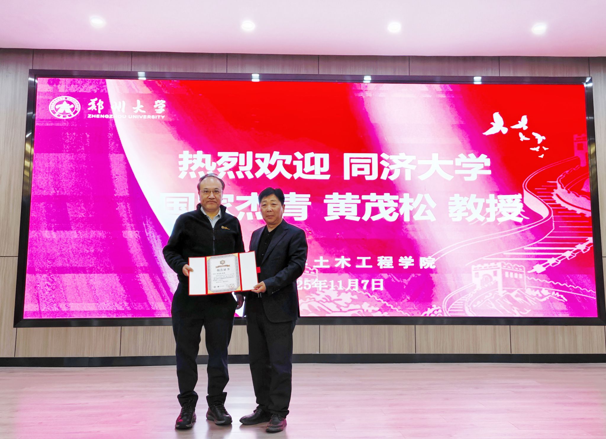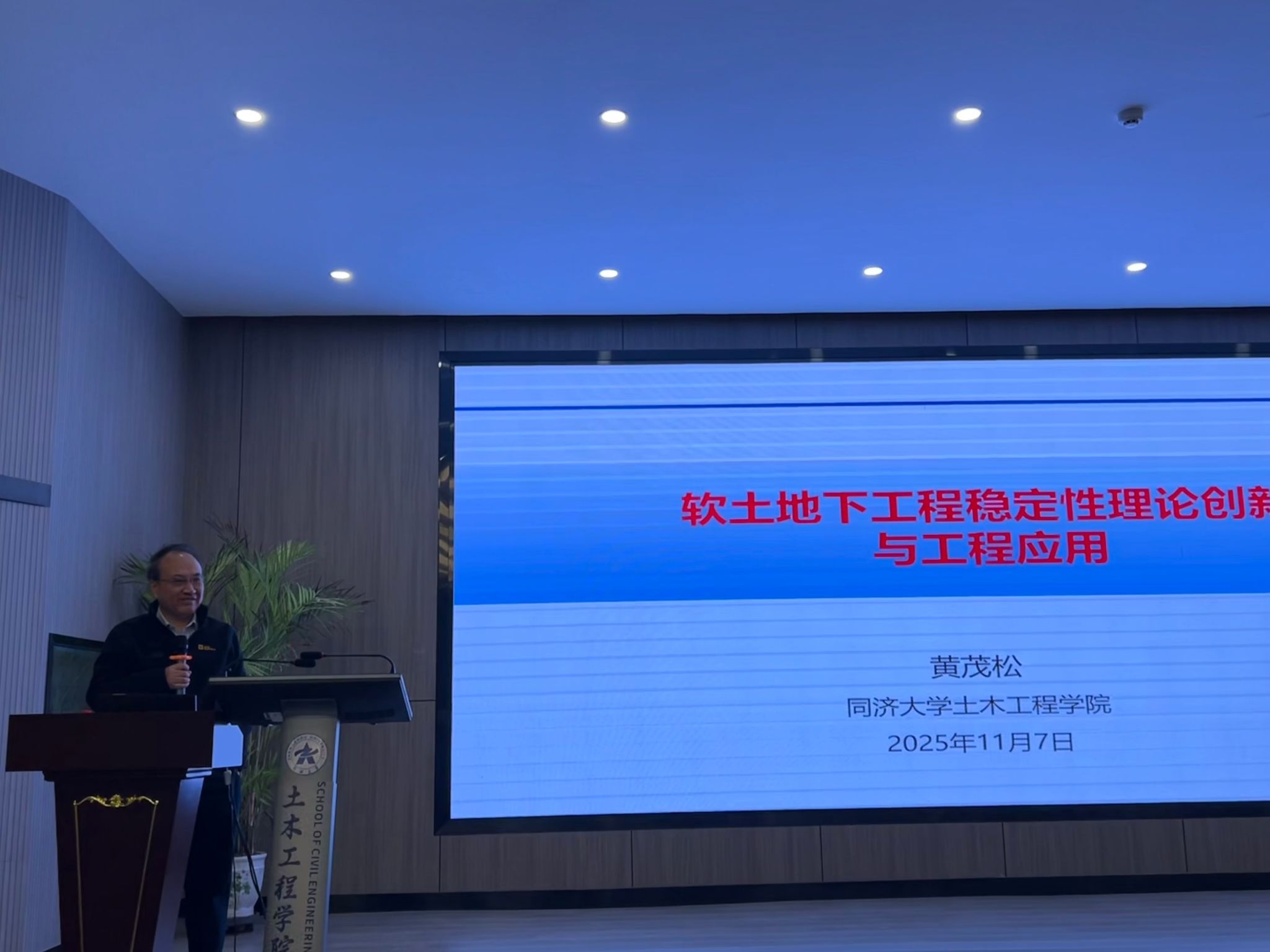黄教授介绍了他在软土力学、软土工程及软土地基基础动力学领域的理论与应用研究。进行了地下连续墙成槽整体稳定性分析与离心模型试验的介绍,包括泥浆渗透理论模型和试验装置;介绍了盾构隧道开挖面稳定性的三维上限分析方法,结合非均匀剪流机构与平动块体理论,展示了在软土力学领域的理论突破与工程实践成果。最后,沈洪波书记为黄教授颁发了证书。