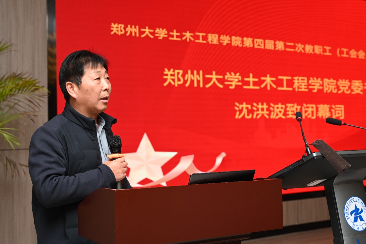 最后,土木工程学院党委书记沈洪波同志致闭幕词。沈书记对大会的顺利召开表示祝贺,对全体教职工长期以来的辛勤付出表示衷心感谢,并对学院未来发展提出了殷切期望和明确要求。他强调,全院教职工要进一步增强责任意识和主人翁意识,凝心聚力、真抓实干,共同推动学院各项事业高质量发展。