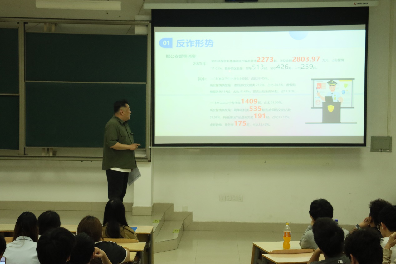 讲座中,朱腾以“筑牢防线 谨防诈骗——防范电信网络诈骗主题教育”为题,结合全国及郑州市电信网络诈骗形势,用真实案例为在场学生上了一堂生动而深刻的反诈安全课。他指出,当前电信网络诈骗案件仍处于高发态势,学生群体受骗案例时有发生。朱腾通过剖析校园内高发的网络游戏交易、虚假招聘等典型诈骗案例,为在场同学敲响了警钟。